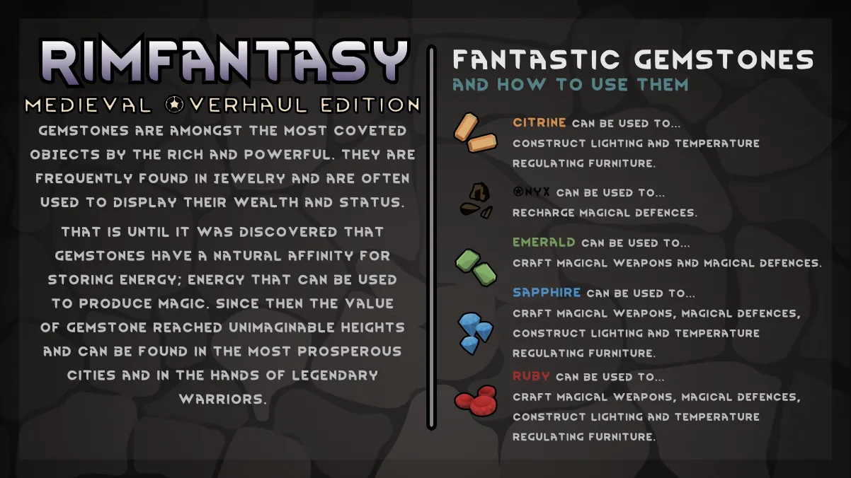 [i]This version of RimFantasy has been reworked and rebalanced to adhere to [url=https://steamcommunity.com/sharedfiles/filedetails/?id=2553700067]Medieval Overhaul[/url] standards. It is no longer modular and includes new/altered/removed content.[/i]