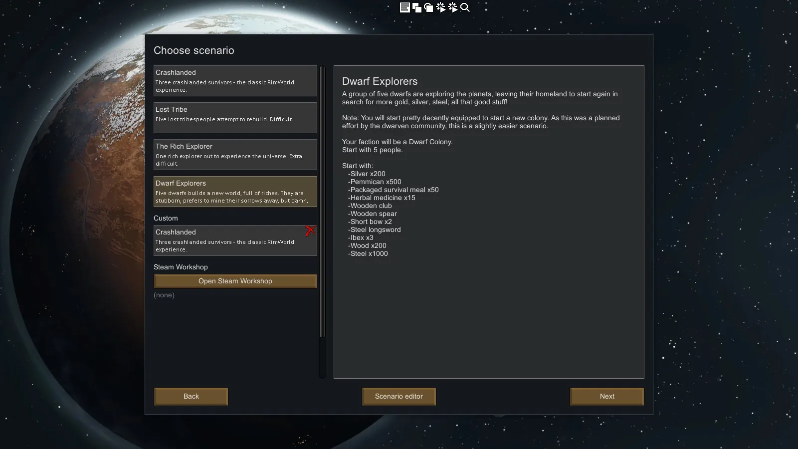 - Dwarf Scenario: An easier scenario, with 5 dwarves and 3 goats, and a little extra building materials.