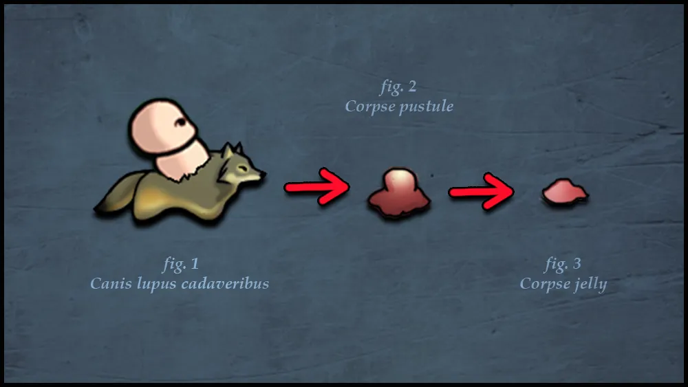A corpse wolf will drop a corpse pustule upon death (as long as the back corpse is not destroyed). Colonists can use a butchers table/spot to harvest corpse jelly from a corpse pustule. Each pustule contains 40 jelly. While it does provide nutrition, colonists will be unhappy if they have to eat corpse jelly.
