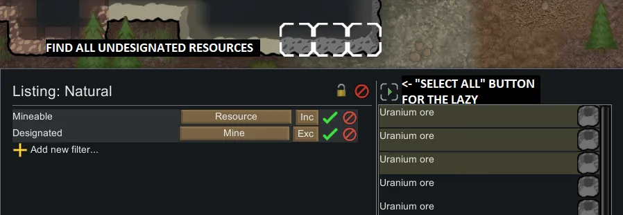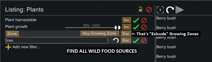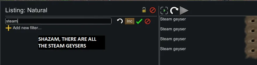 The main category can quickly filter down to things you want. Literally everything is shown for 'All' - even every patch of grass. But 'All' also searches inside inventories, while other categories only shows things directly on the map.