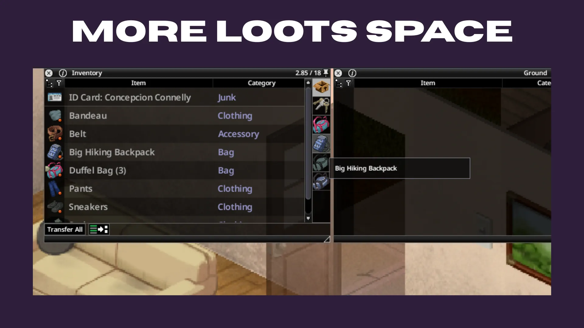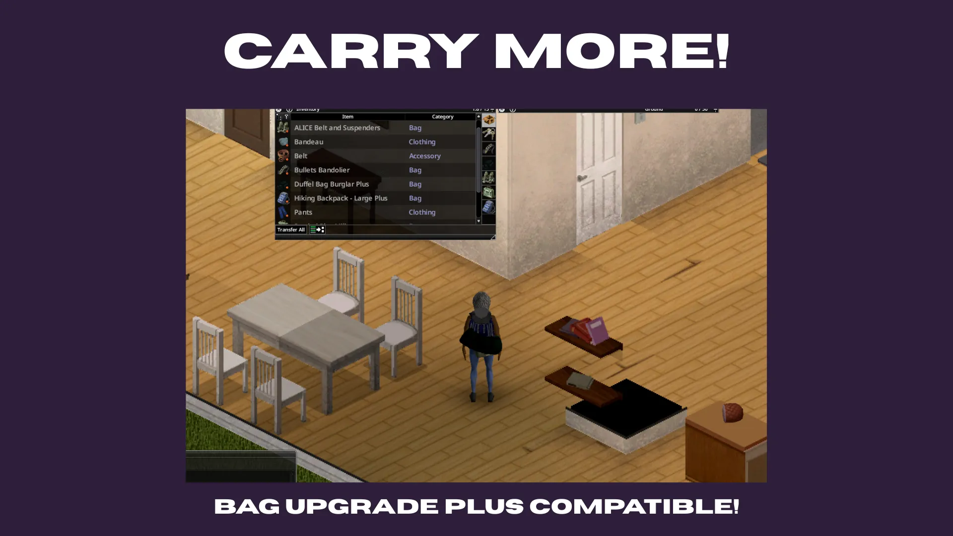 This mod will replace the slot for duffel bag from character back, it'll allow players to wear a backpack and duffel bag at the same time. Increasing your carry capacity for adventure and moving items. Inventory management is crucial in project zomboid that's why I made this mod.