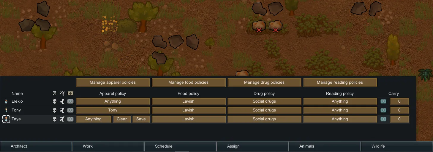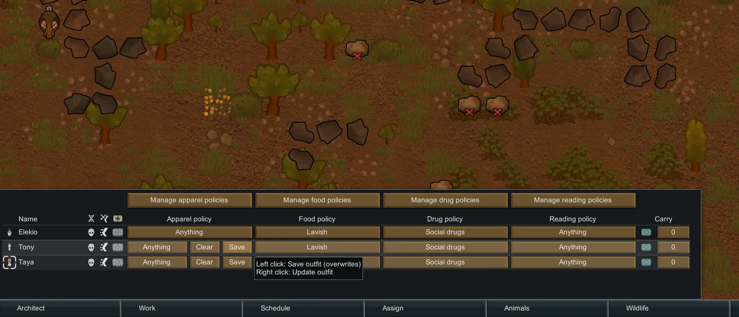 Left click: Create and assign a new outfit policy with the name of the selected pawn, with only the currently worn apparel set to allow. Forced wear is then released.