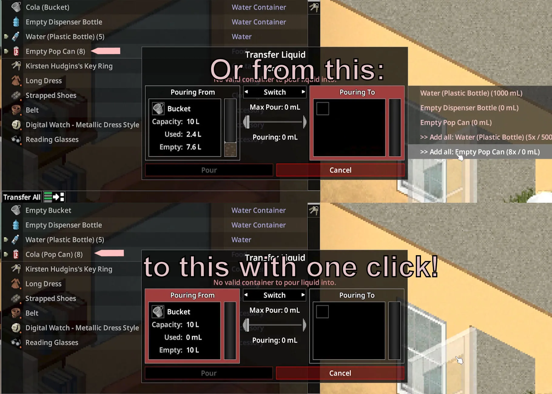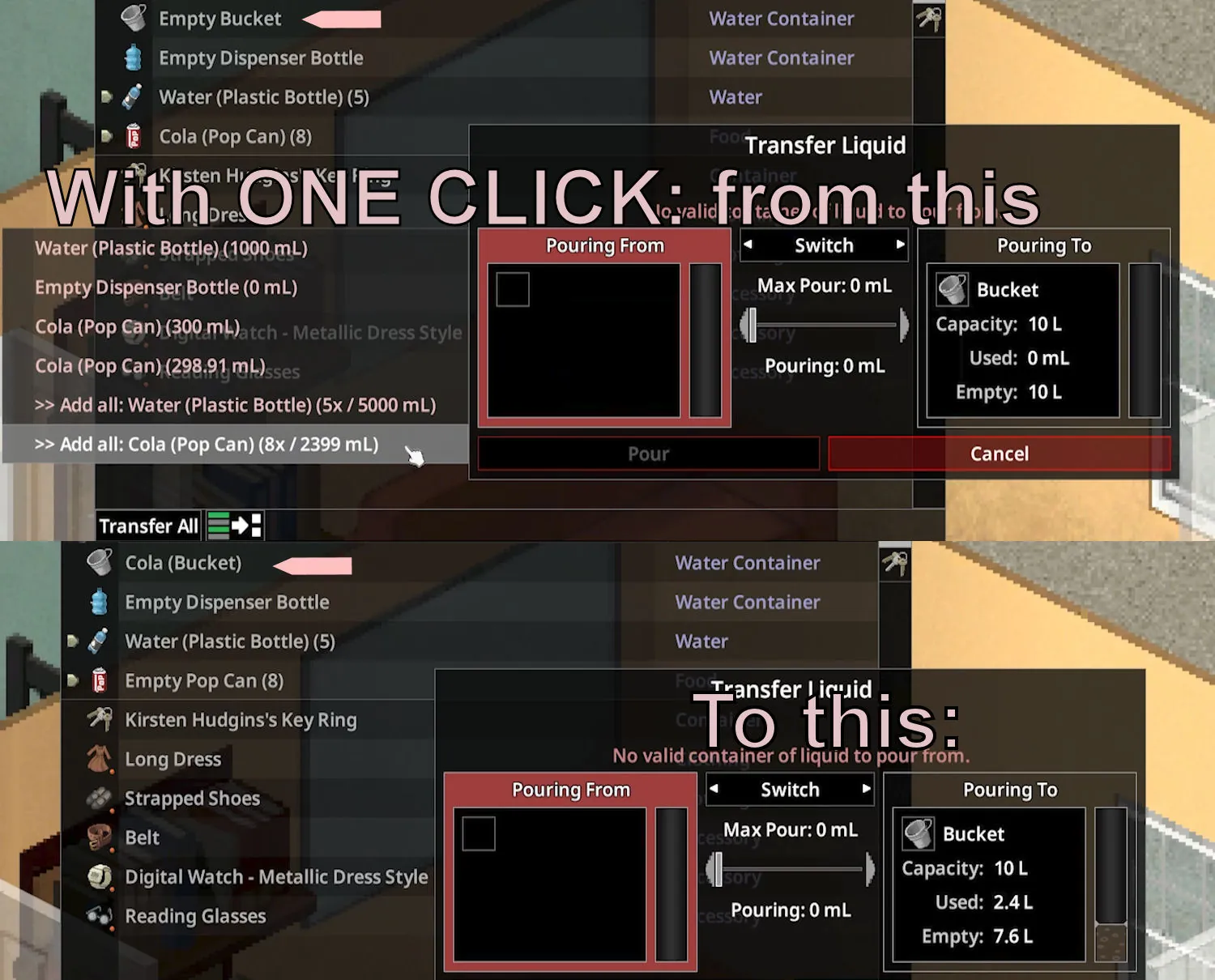 50 cola cans to fill in a bucket too annoying? With this mod you only need one click and not 100 clicks (or more)!