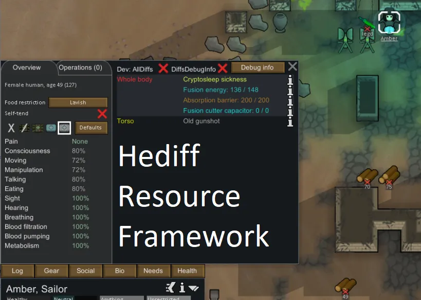 Hediff Resource Framework adds a variety of functionality and features to hediffs using a new custom hediff class, HediffResourceDef. This framework does nothing by itself, but when combined with a mod that is configured to use its features, it is capable of a number of new features and mechanics. You can find a wiki highlighting all of the added mechanics and fields here: