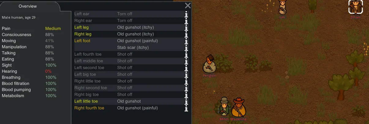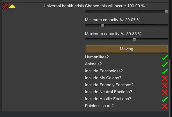 Have a universal health crisis! Limit the capacities of your colonists, animals, friends, and enemies! Completely customizable!