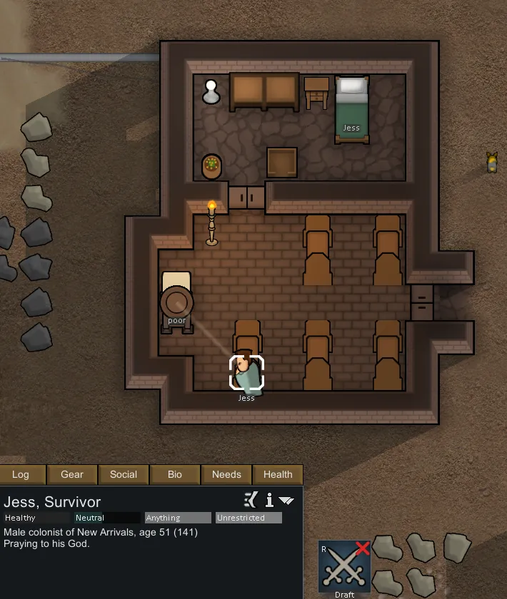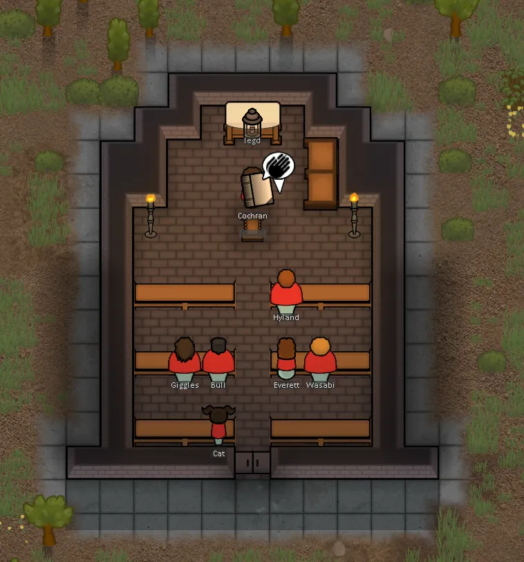 If you want to improve the mood of your characters, you can set worships in your church. You have to build a lectern, to buy a holy book, to set a preacher to this lectern and to schedule your worships and so on. Beware! If your preacher is not well qualified, colonist will gain bad thoughts about worships.