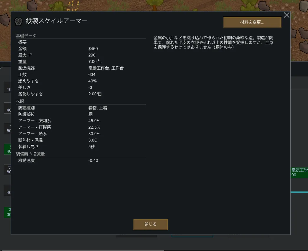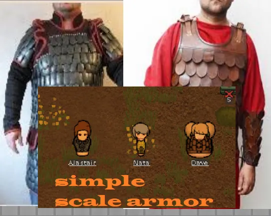 部族向けに鍛冶で解禁される軽装鎧(スケイルアーマー)を追加します。 デビルストランドやサイ革のダスターコートクラスをちょっと上回る防御性能で、 保護範囲は時代を鑑みて胴のみ。 プレートアーマー程優秀では無いですが移動速度をそこまで妨げず、 常用できコストも軽いです。 日本語化済み by marta