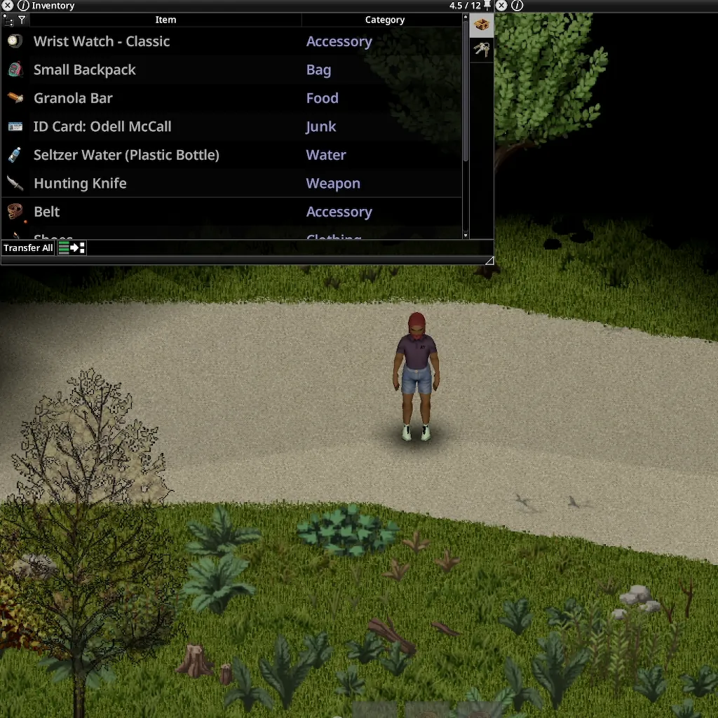 You will start with a small backpack, hunting knife, classic watch, granola bar and a bottle of water. The bottle of water randomizes between seltzer and regular water. It's still water.
