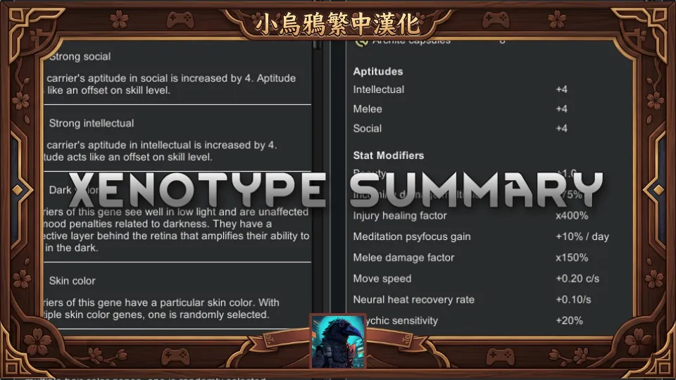 Xenotype Summary 的繁體中文漢化包。 需要先啟用原版 MOD「Xenotype Summary」 原作者:Waggish Pluto 漢化:小烏鴉 Traditional Chinese translation for Xenotype Summary mod.