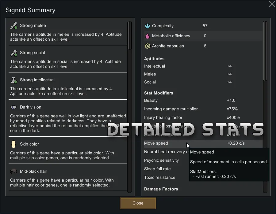 [*] [b]Detailed Breakdowns:[/b] Want to know which specific gene is making your pawn so slow? [b]Hover over any stat[/b] to see a breakdown of every contributing gene. No mystery math!