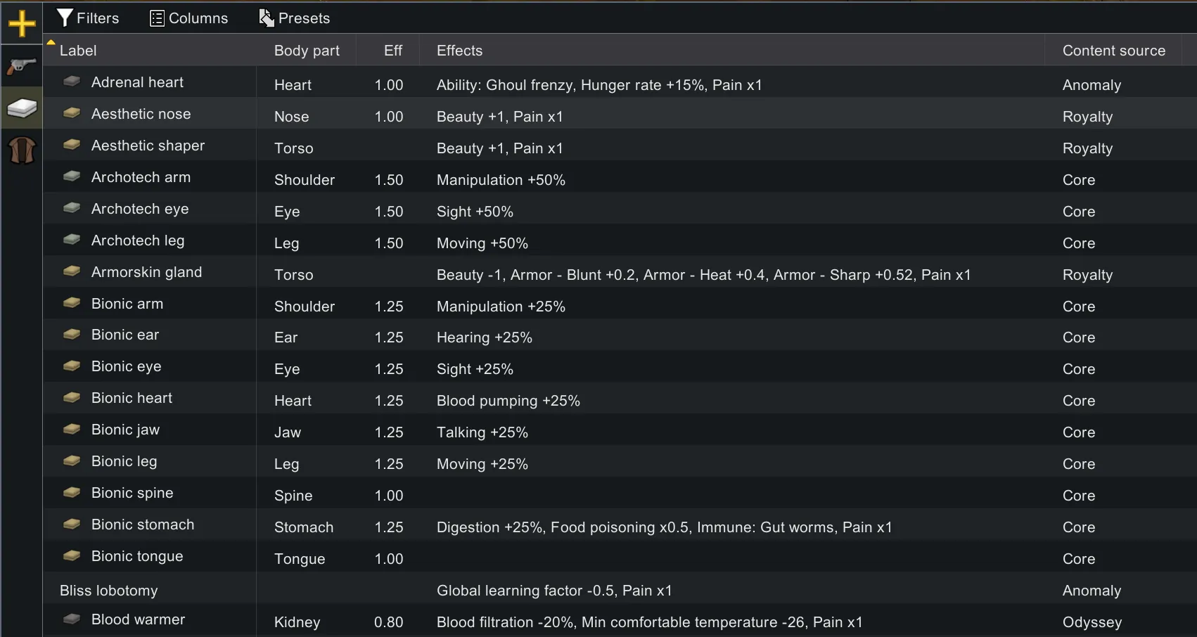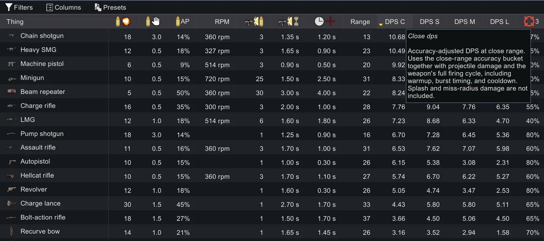 Stats Forked is a declarative stats-table framework mod for RimWorld that lets you compare game content in sortable, filterable tables.