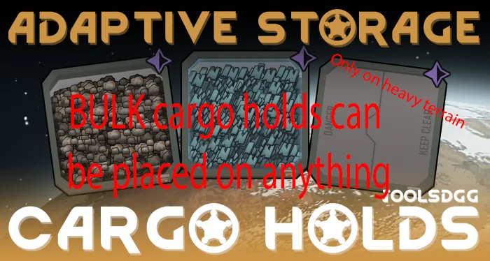 Bulk Cargo holds can now be placed anywhere on heavy terrain. Load after CargoHolds. This is a patch that only changes where you can place the bulk cargo holds, so you can add them to your base.