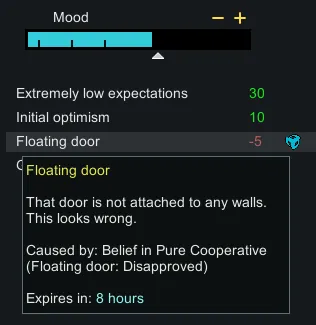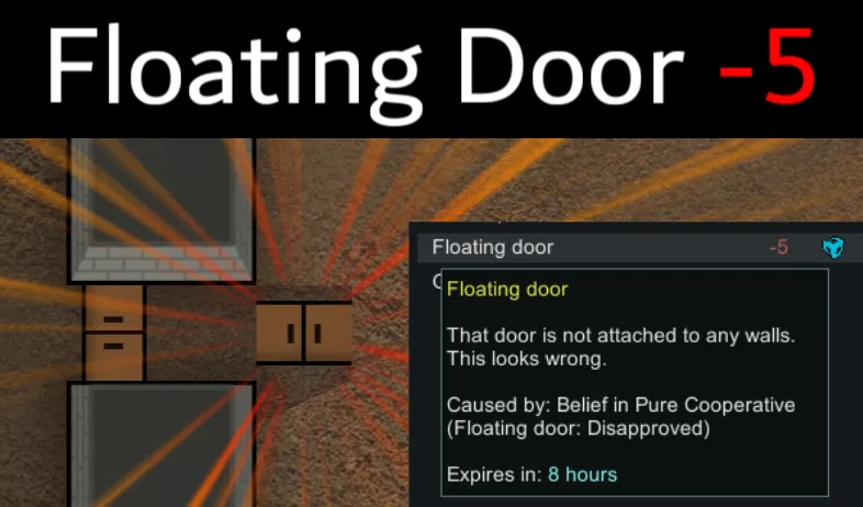 Colonists who see a floating door (a door with fewer than two adjacent structures on its sides) will receive a -5 mood penalty.