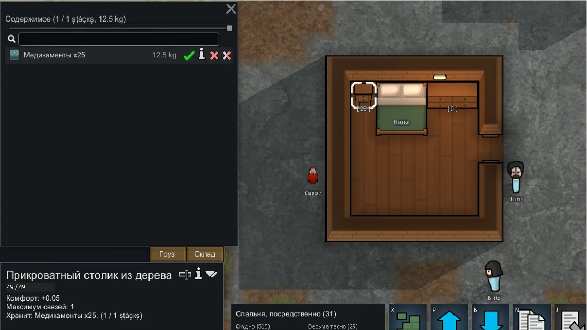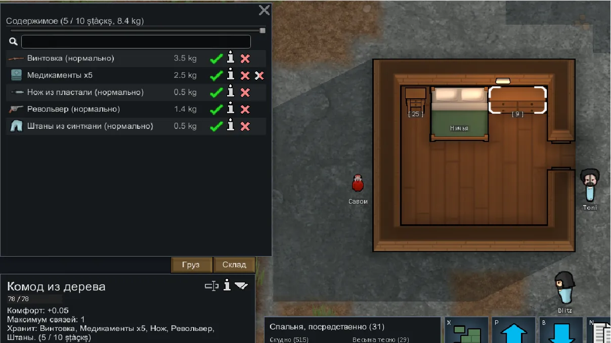 End tables, dressers, wardrobes, and filing cabinets can now store items: medicine, clothing, weapons, food, and resources.