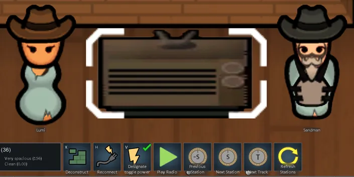 Build a colony radio and use its gizmos to play, pause, switch stations, skip tracks, and refresh the station list.
