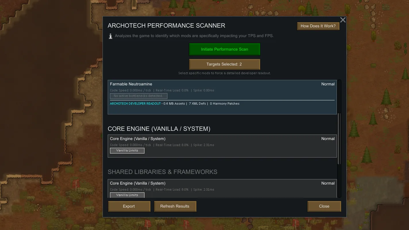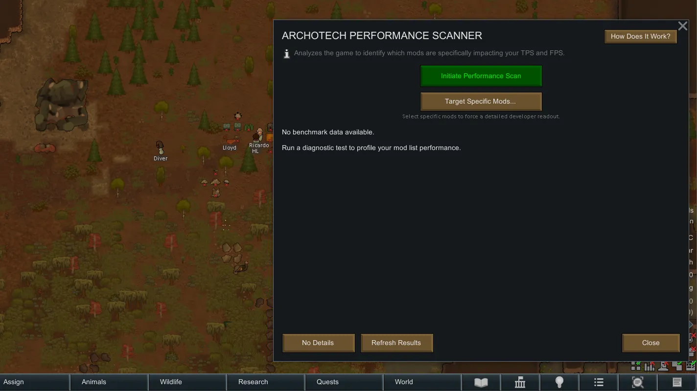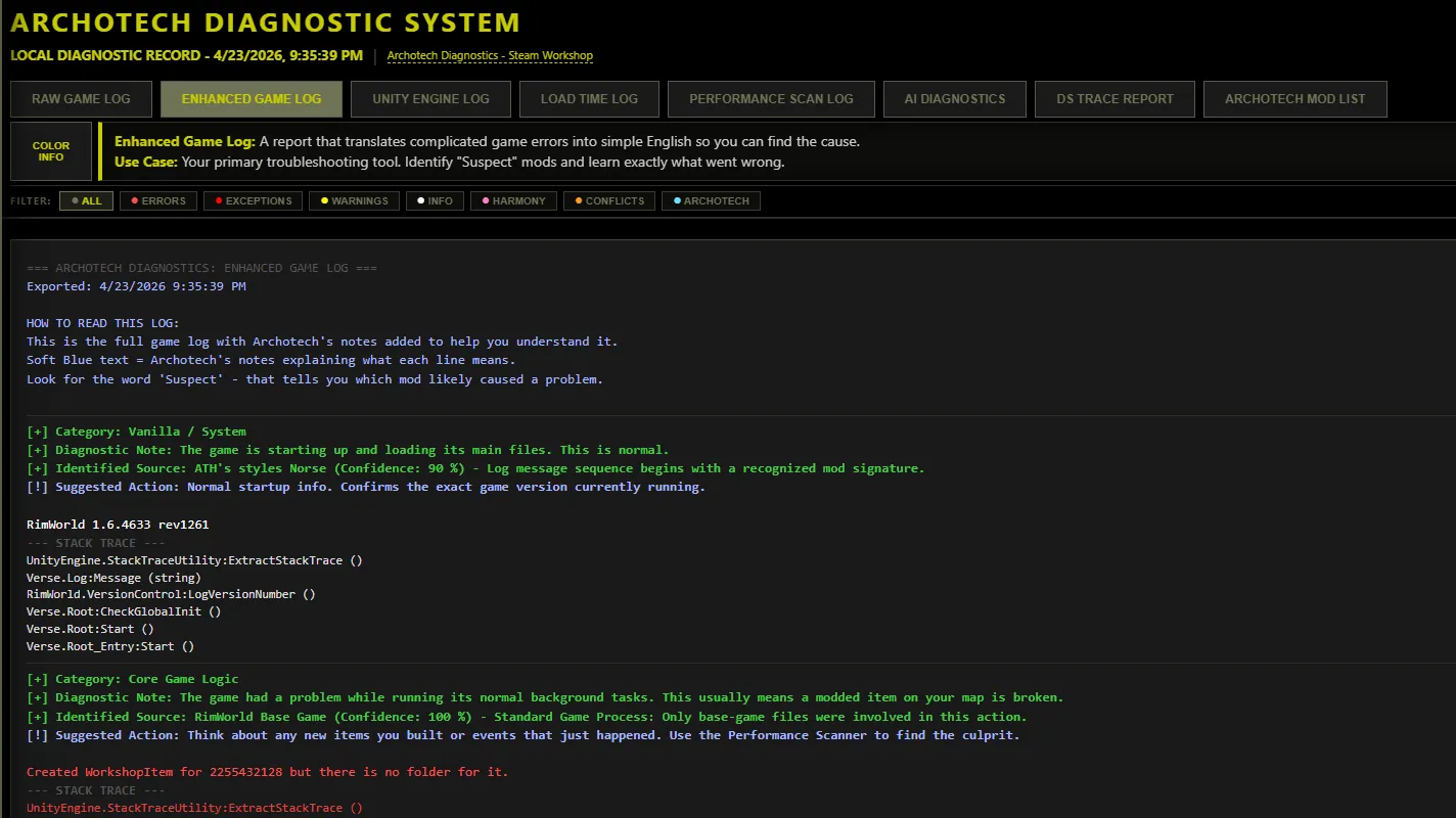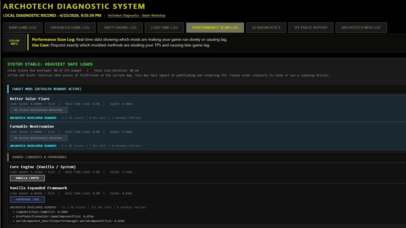 [b]Archotech Diagnostics[/b] is a collection of tools designed to help you understand what is happening under the hood of your RimWorld game. It actually started out as a simple, small alternative to HugsLib's log sharing feature, but it has since grown into a much larger project.