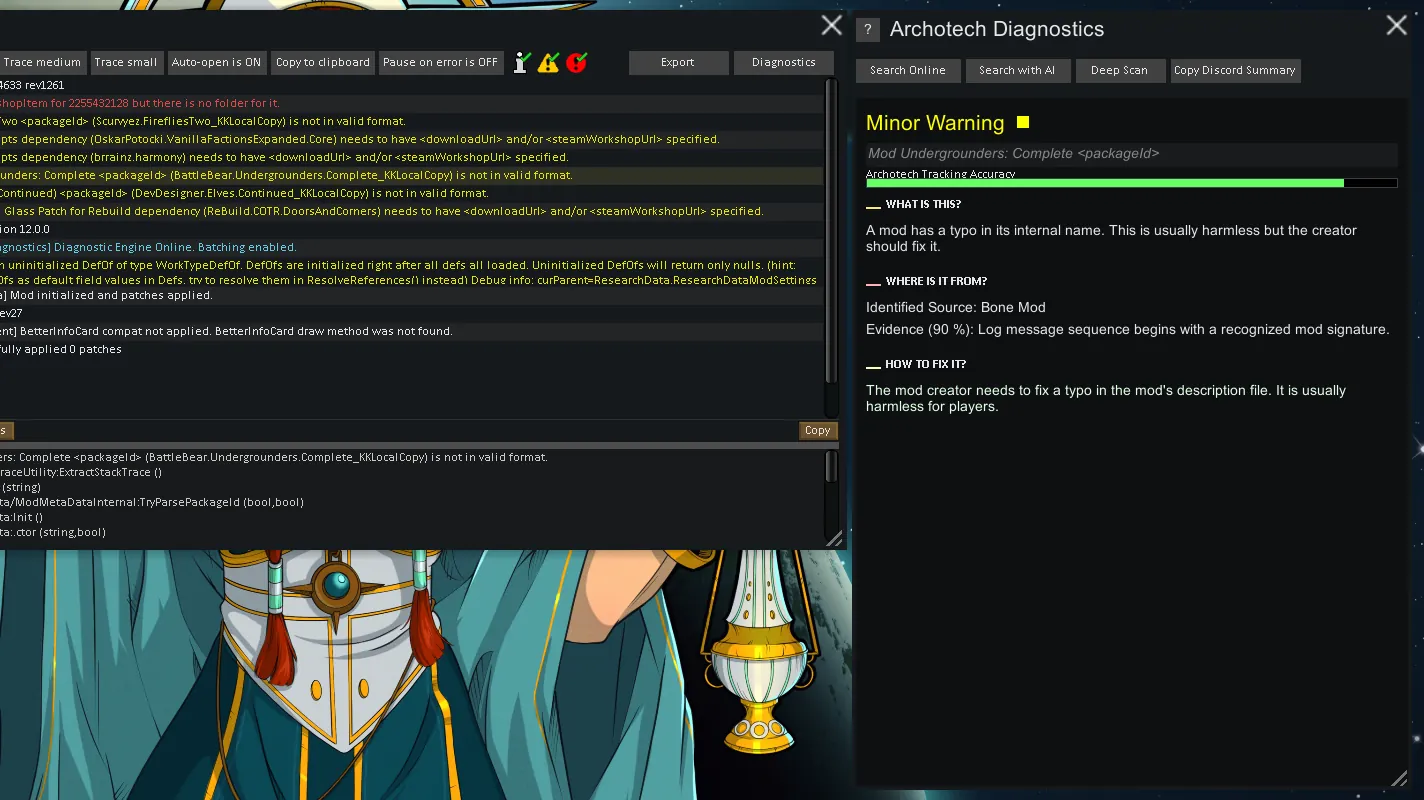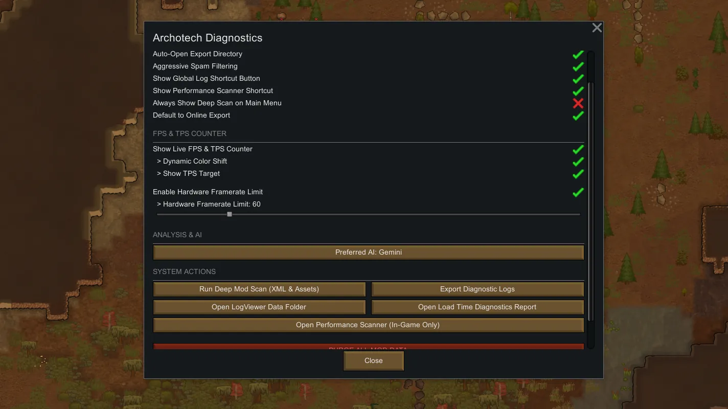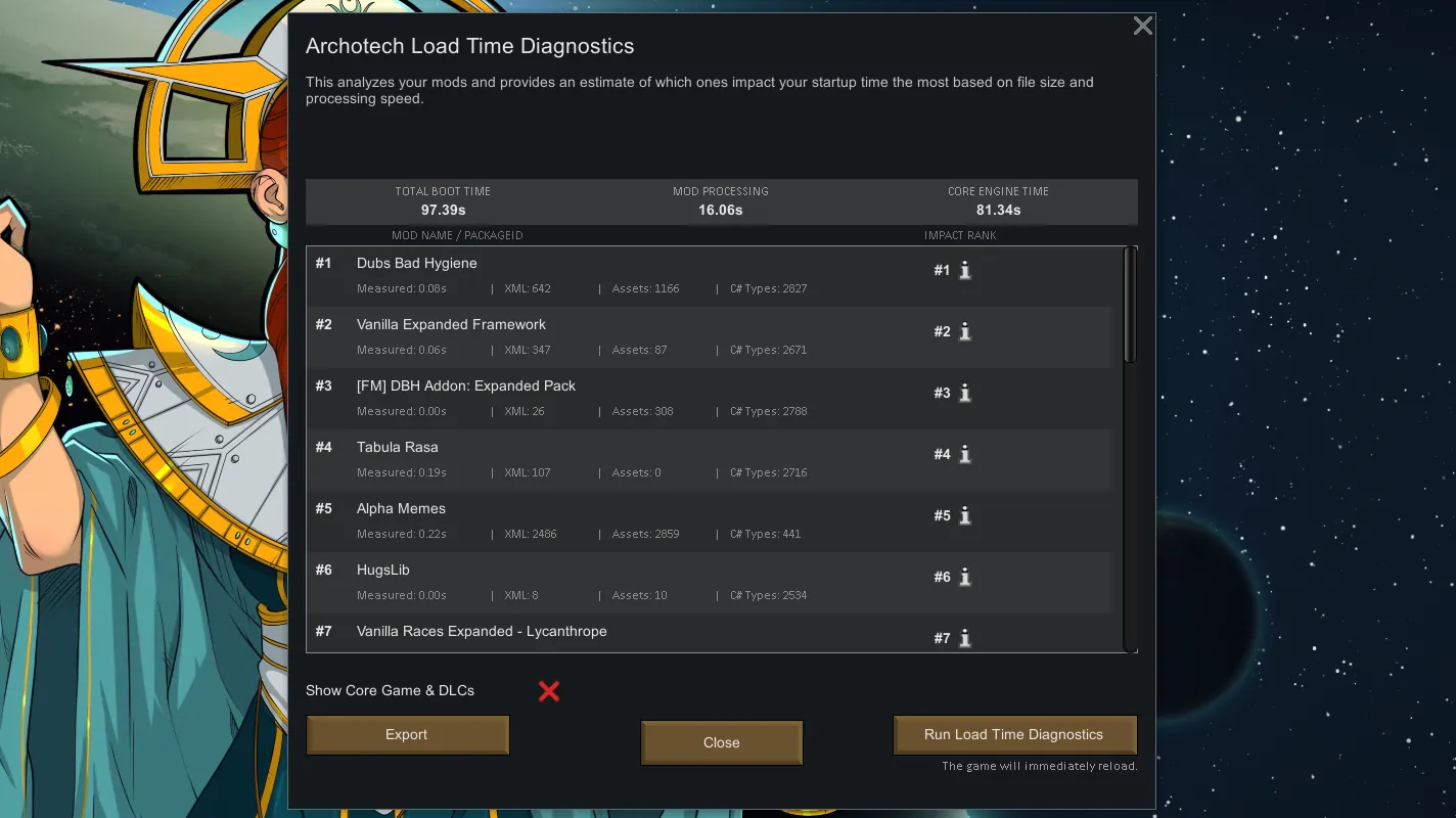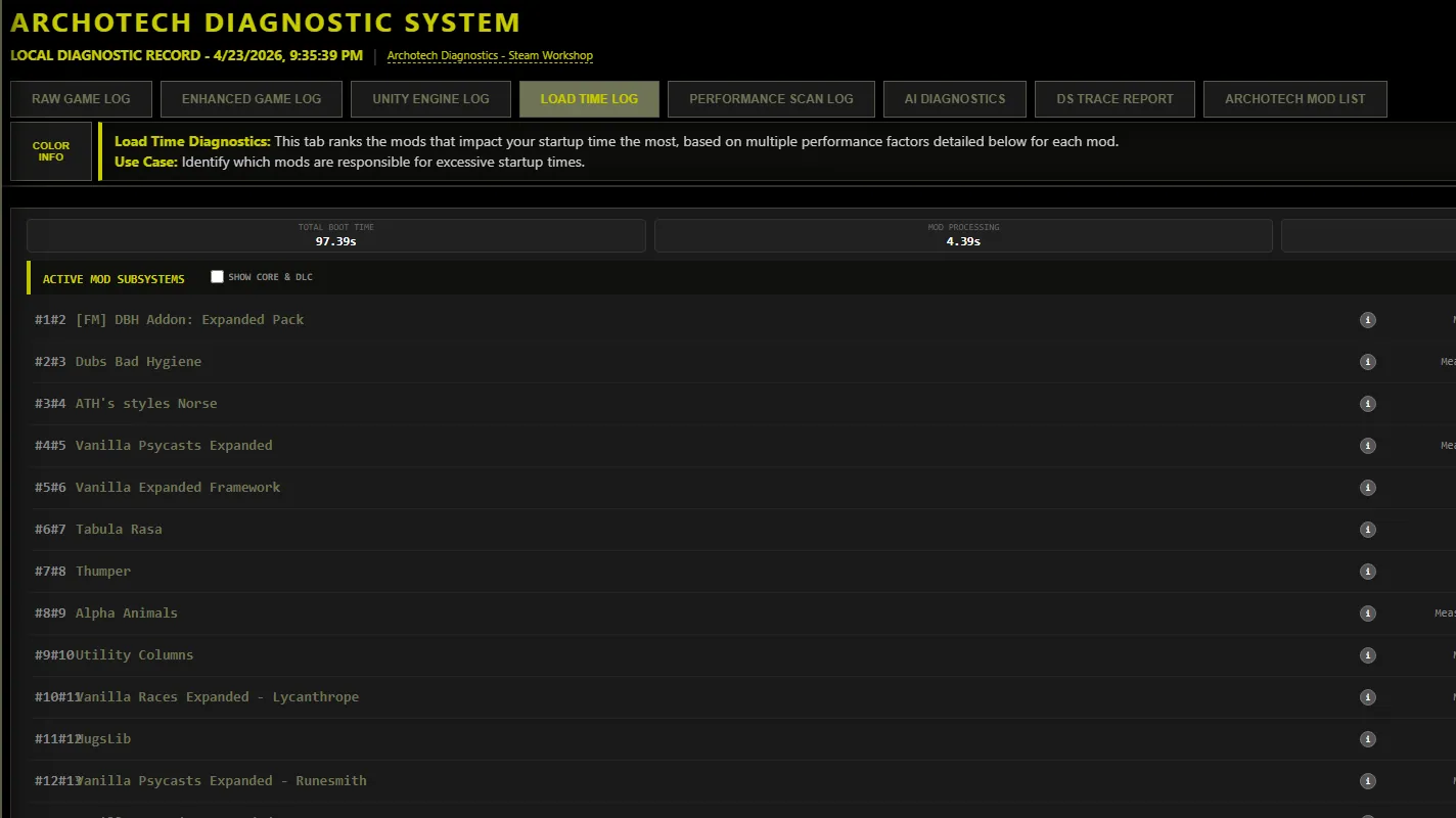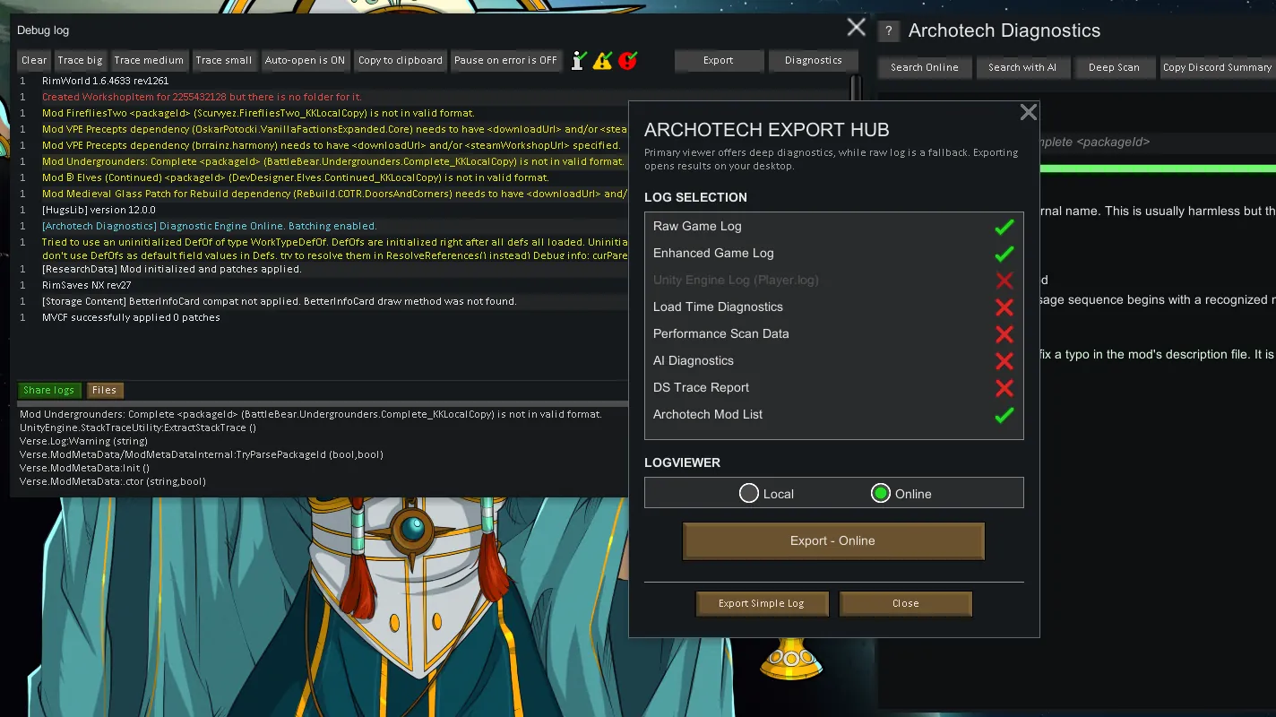 [b]Archotech Diagnostics[/b] is a collection of tools designed to help you understand what is happening under the hood of your RimWorld game. It actually started out as a simple, small alternative to HugsLib's log sharing feature, but it has since grown into a much larger project.