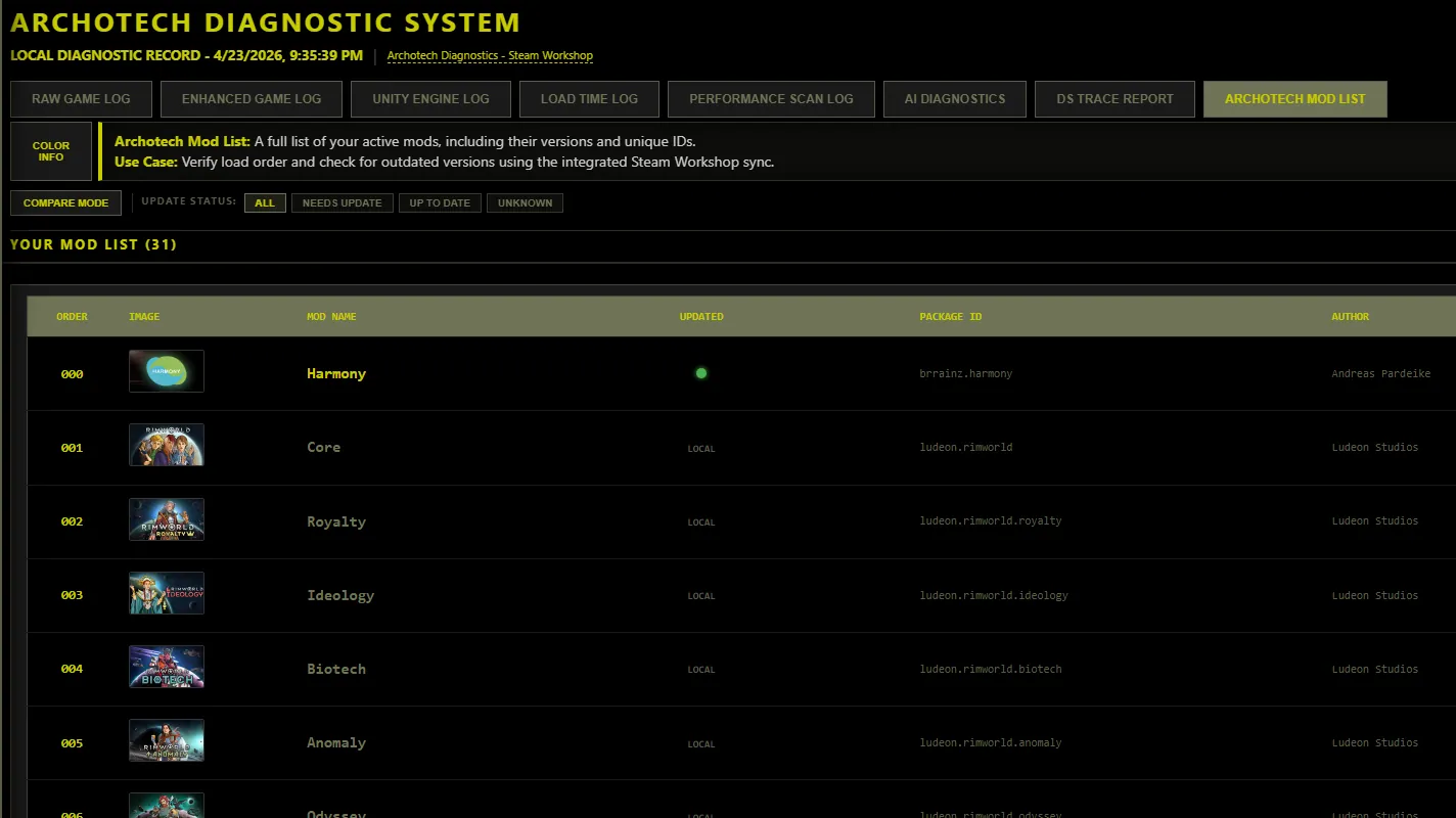 - [b]Archotech Mod List:[/b] A detailed overview of your mod list. The layout is designed to be used as a "dual site" comparison, allowing you to open two reports side-by-side to easily spot version or load order differences.