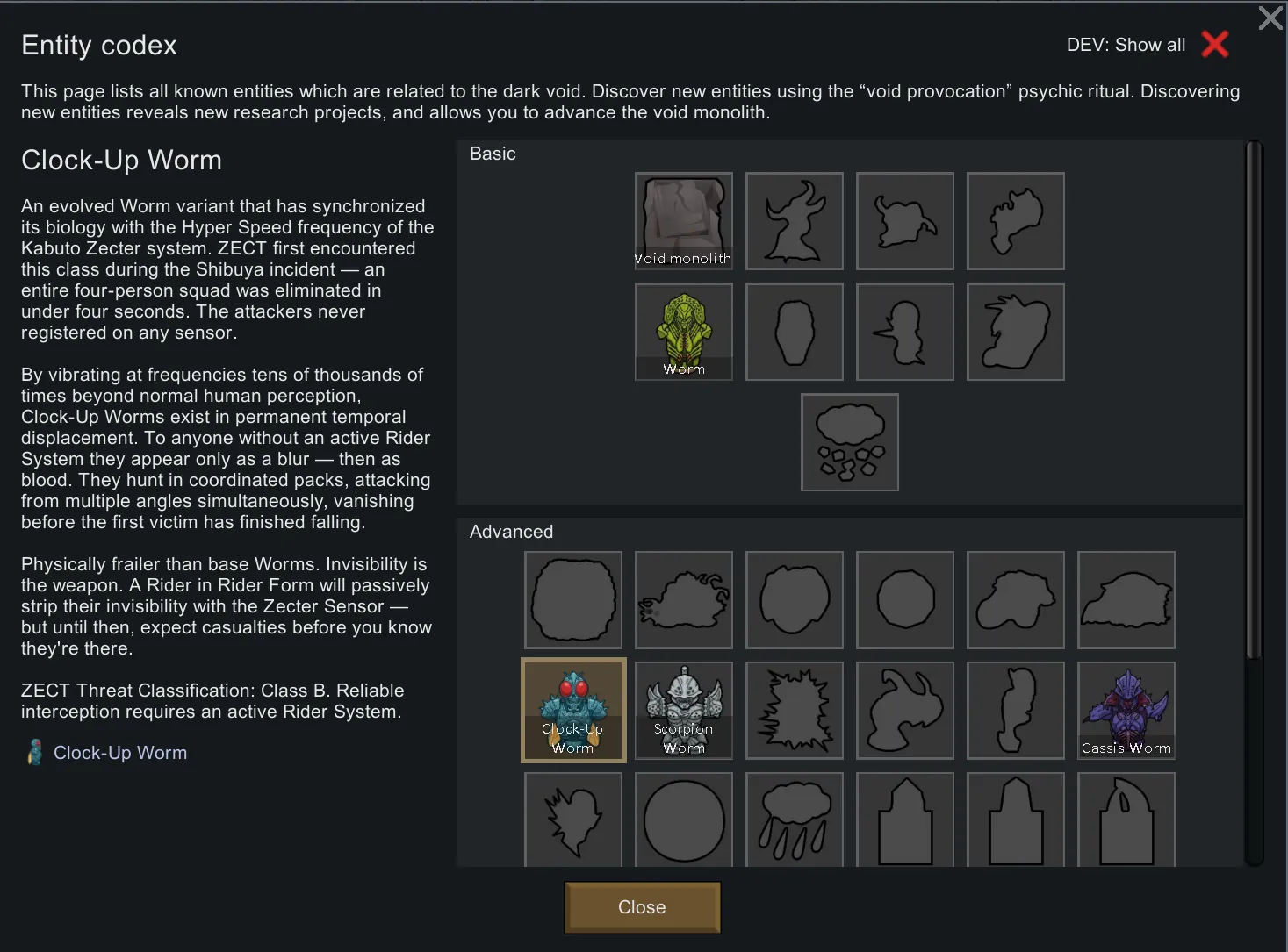 This mod integrates fully with the Anomaly DLC: Worms arrive as escalating entity threats, the Entity Codex tracks them, and the Zecter's energy economy ties directly into the bioferrite loop. If you've never seen Kamen Rider Kabuto, think: a colonist who can turn invisible, move faster than the eye can see, and end a fight with a single finishing kick.