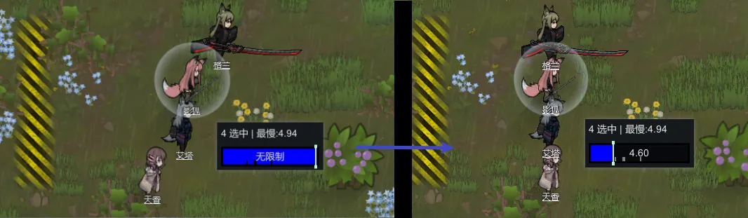 • [b]控件合并优化:[/b]若同时选中多个可调速Pawn时,限速调整控件将自动合并,此时若进行拖动调整,即将所有可调速Pawn的限速同步到目标限速。(此时阈值线为各Pawn的最大移动速度,标题会显示已选中Pawn数量,与其中移动速度最慢的那位的最大速度)(此时的Gizmo标题的末尾标识会显示此组可调速Pawn的当前限速是否一致 即 " --:一致;II:不一致")