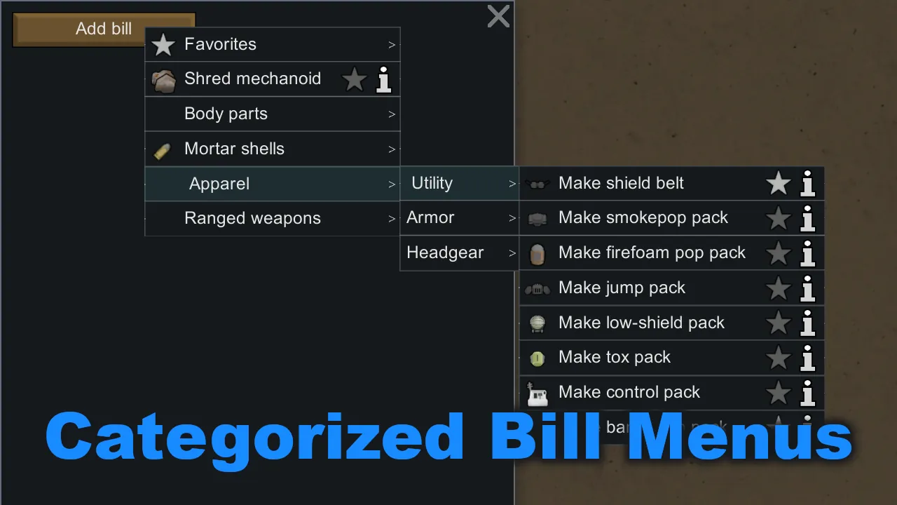 Also adds a "Favorites" sub-menu (if any favorited recipes are available). Use the star icon to favorite a recipe. Styled items connected to an ideoligion use the same recipe, and are not favorited separately. They will appear in the favorites menu if the base recipe is favorited.