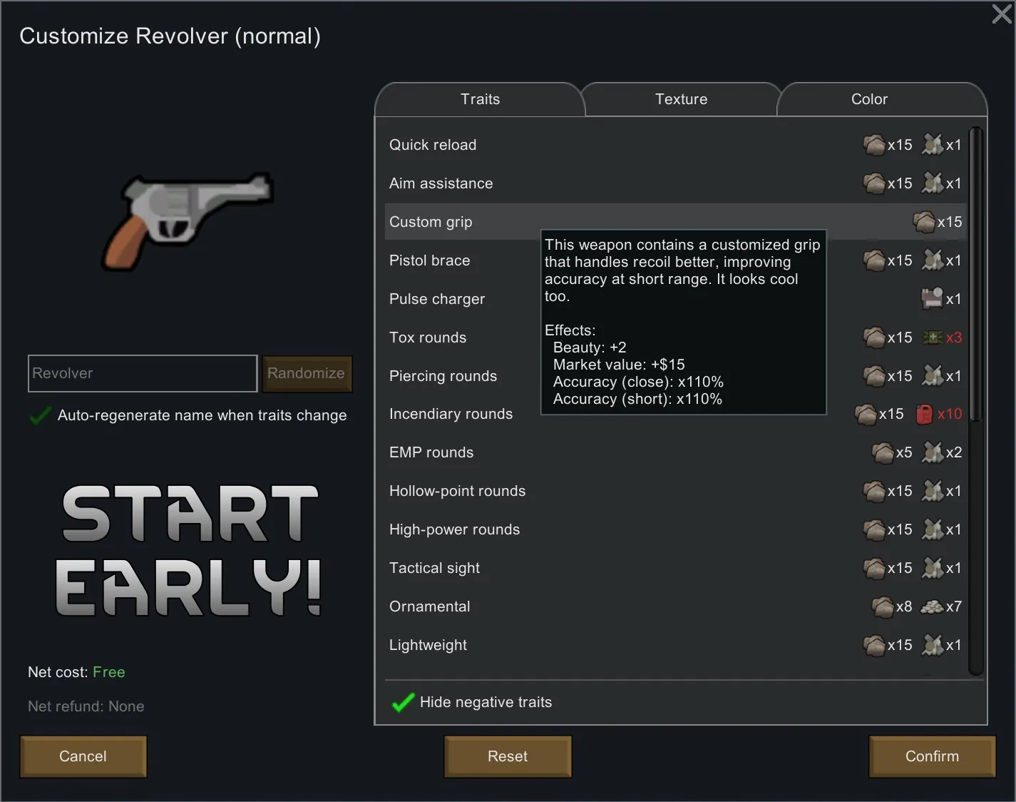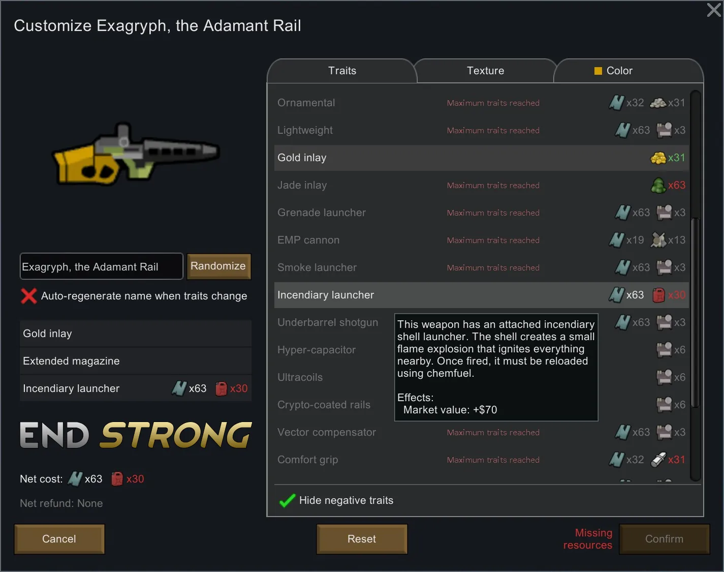 [*] Material-intrinsic traits auto-detect from their trait names, so Gold Inlay costs gold, Depleted-uranium rounds costs uranium
