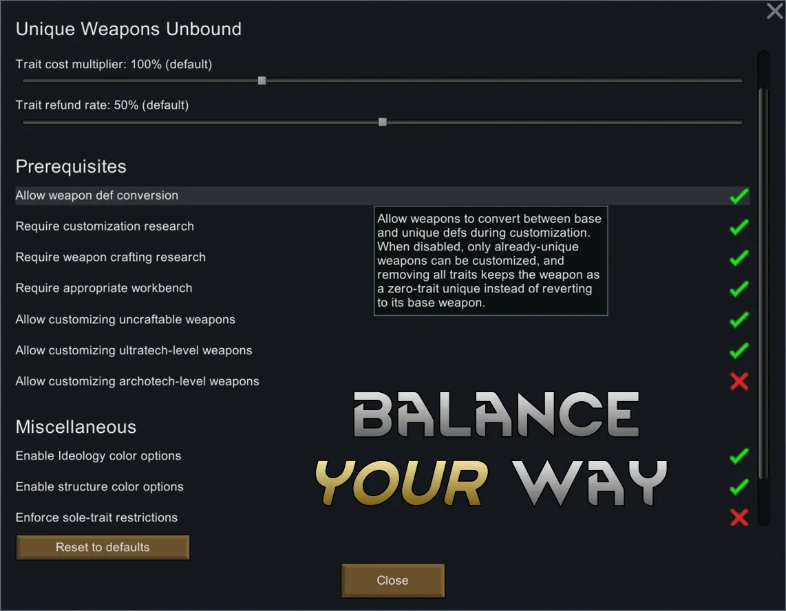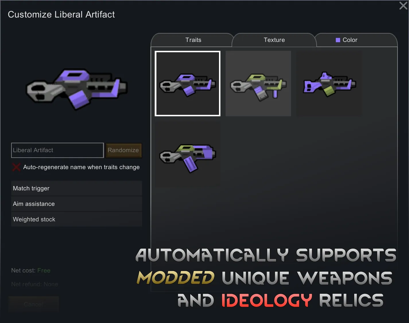 [*] Automatically compatible with mods that add new unique weapons, weapon traits, or crafting recipes. No hard-coded def references