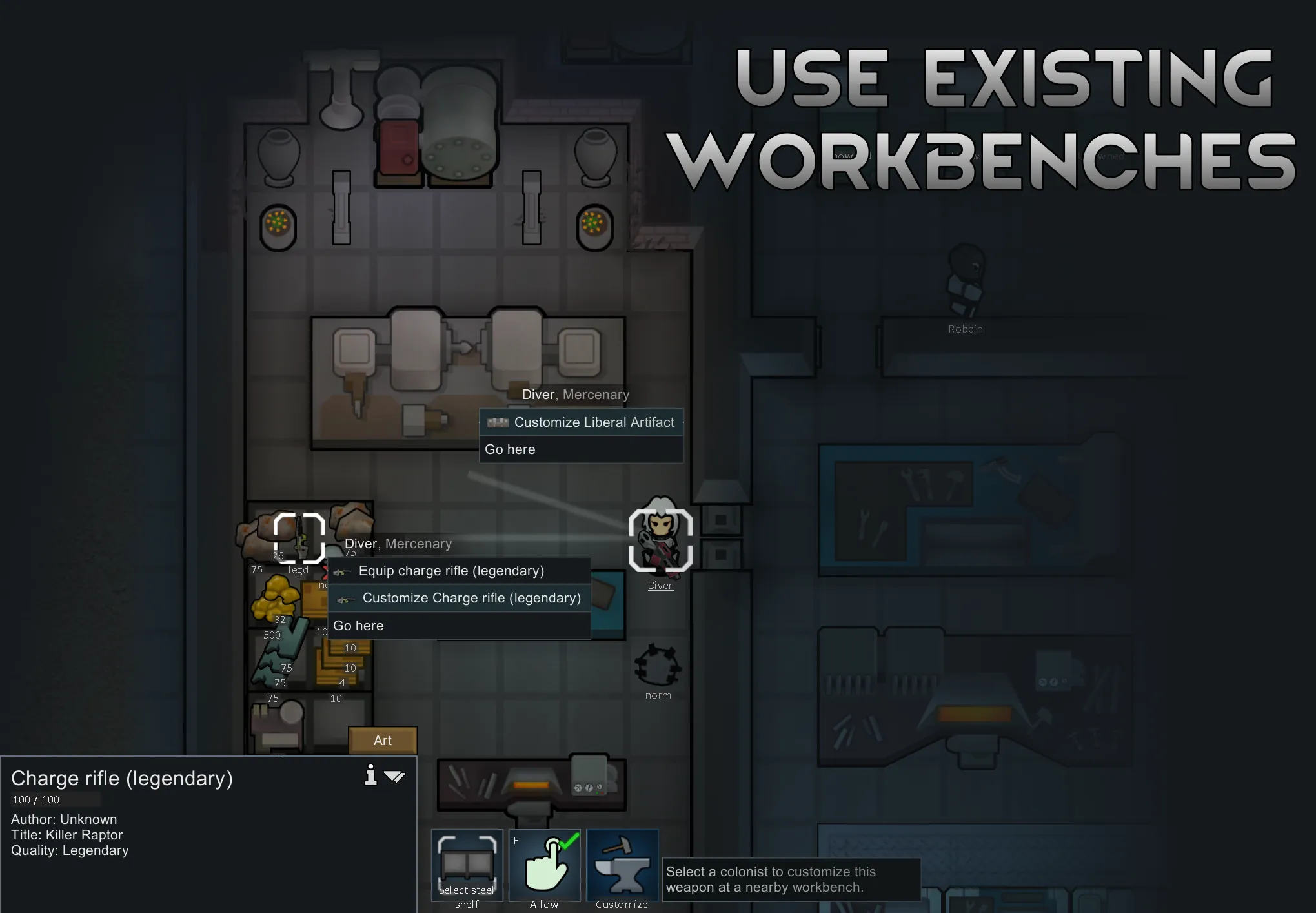 [*] [b]Ground weapon menu:[/b] right-click a weapon on the ground to send a colonist to the nearest suitable workbench