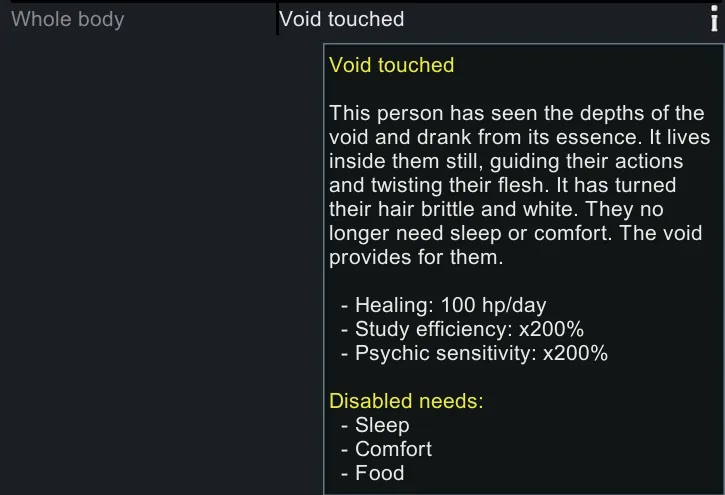 Disables hunger for pawns with VoidTouched (Anomaly DLC).