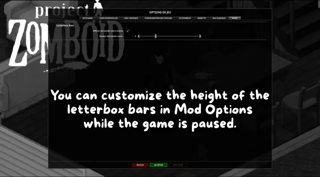 - Cinematic letterbox bars (you can custom in Mod Option while the game is paused)