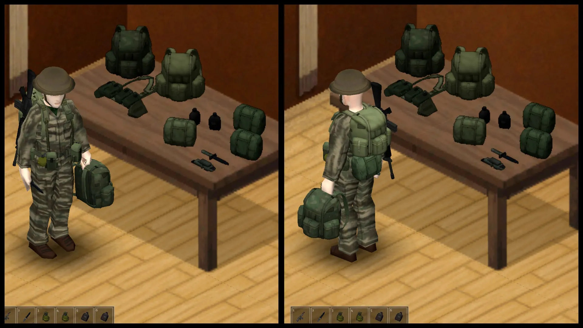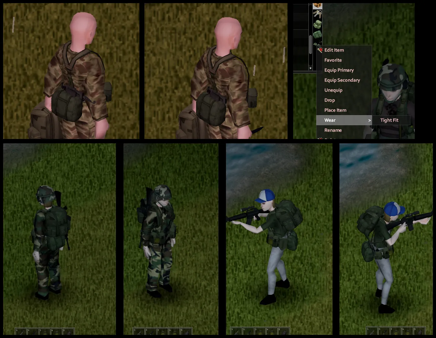 [*] ALICE Weebing - Vest, that can be worn Tightly or made Loosen for the best possible compatibility with variety of other clothing items, consist of 24 Models (12 models for Male and Female Player Characters which are: 6 Tight and 6 Loosen Fittings). Basic Vest with 2 pouches and 2 Grenade Slots (on That Below) that can be upgraded using Recipe Menu. Feel like Adding Canteen Pouches? You got it. What About Extra Space? Add 2 Extra Pouches And then E-Tool Pouch, or in reverse Order, both increase carrying capacity,