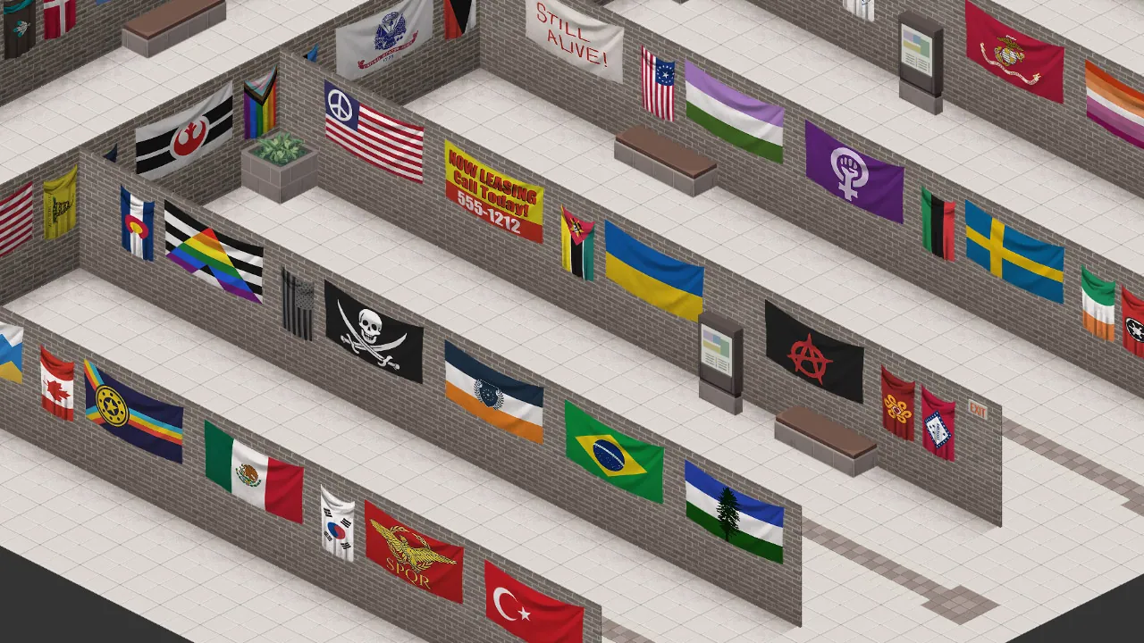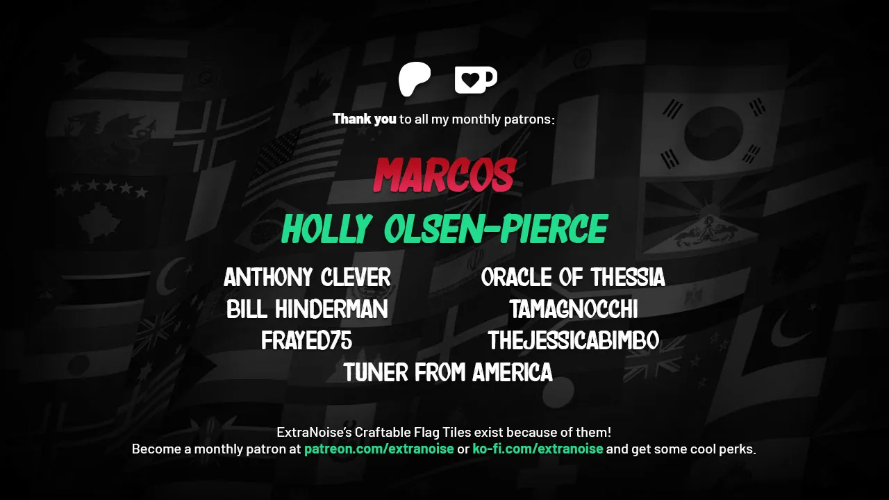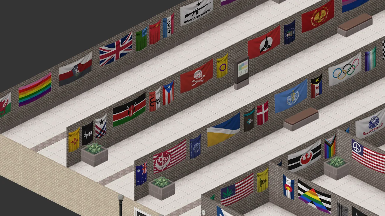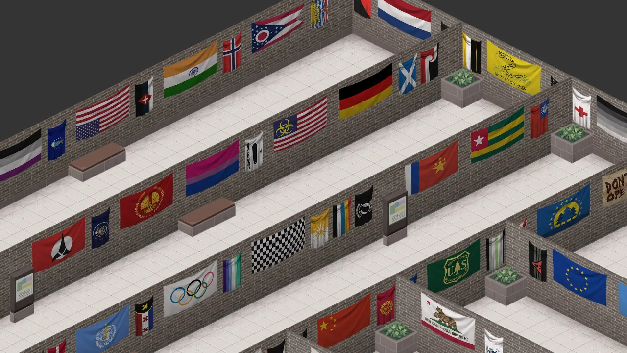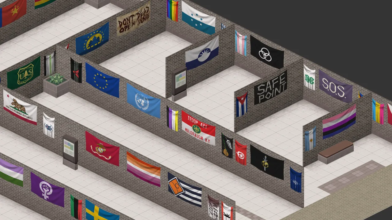 I appreciate everyone's patience as I worked diligently to make each of the flags in the pack craftable--at almost 50,000 lines of code!--so that players can now make them in the game without having to rely on multiplayer server admins to spawn them in (helpful if you are not playing a multiplayer server, as you can imagine). In order to make them, you will need to first craft a blank flag using [b]sheets, scissors, a needle or sewing kit, and thread[/b]. Once a blank flag has been crafted, you will need [b]a paintbrush and paint buckets[/b] to paint the flag. It's not an elegant solution, but it is designed to keep your context menus simple instead of trying to list out 500 options when you accidentally right-click a sheet in your inventory.