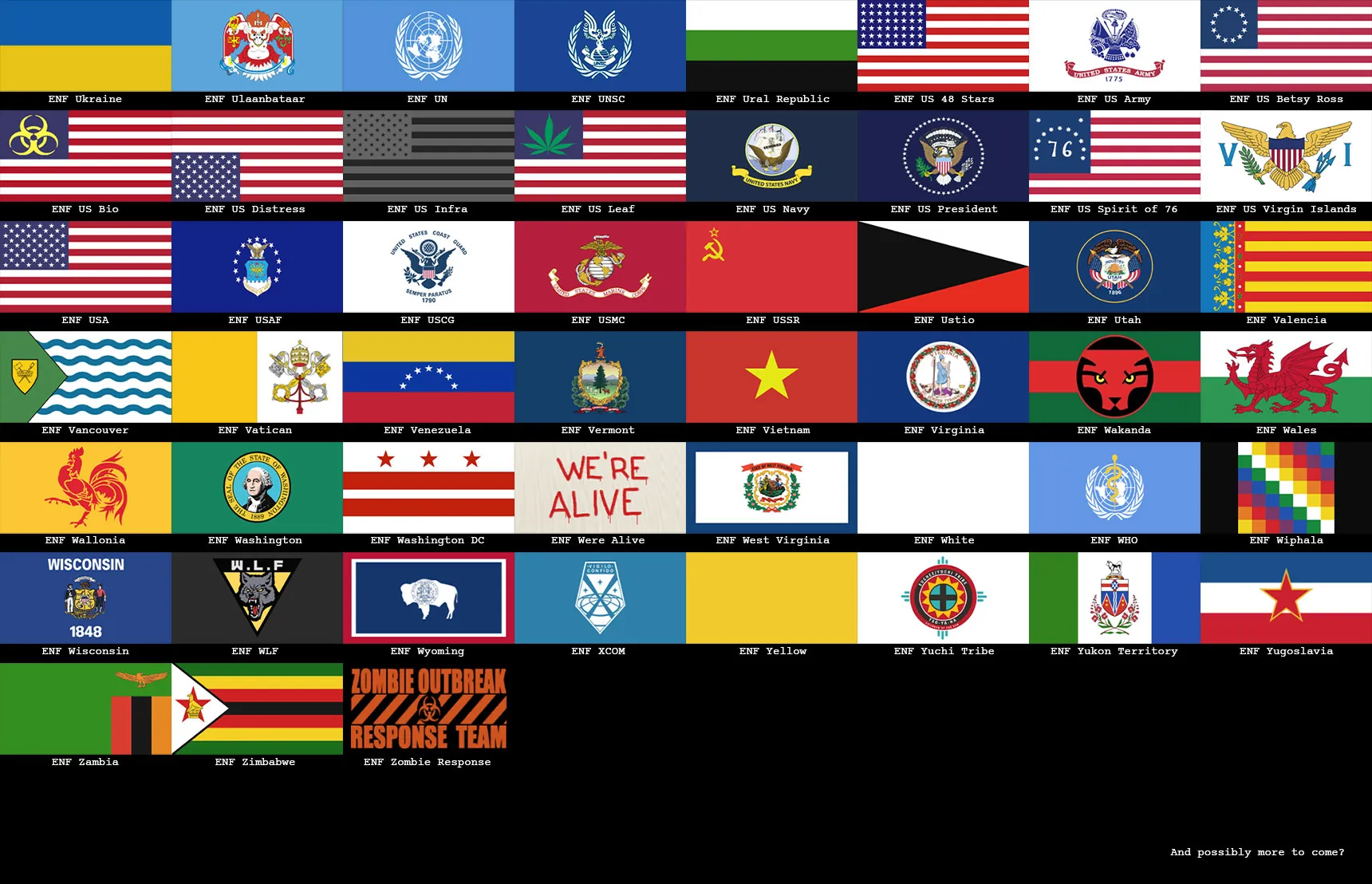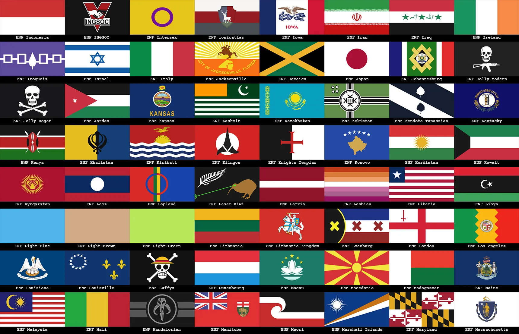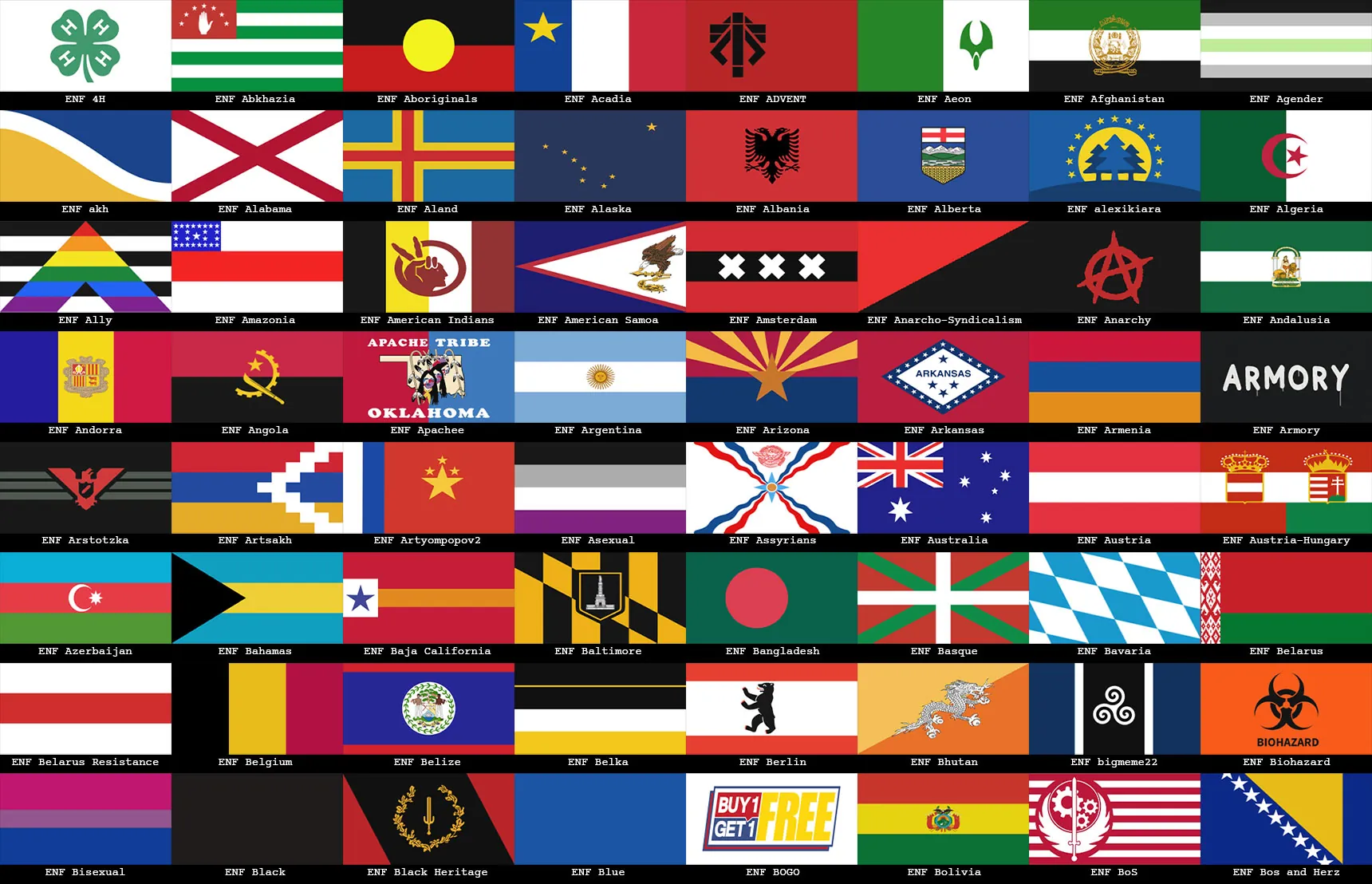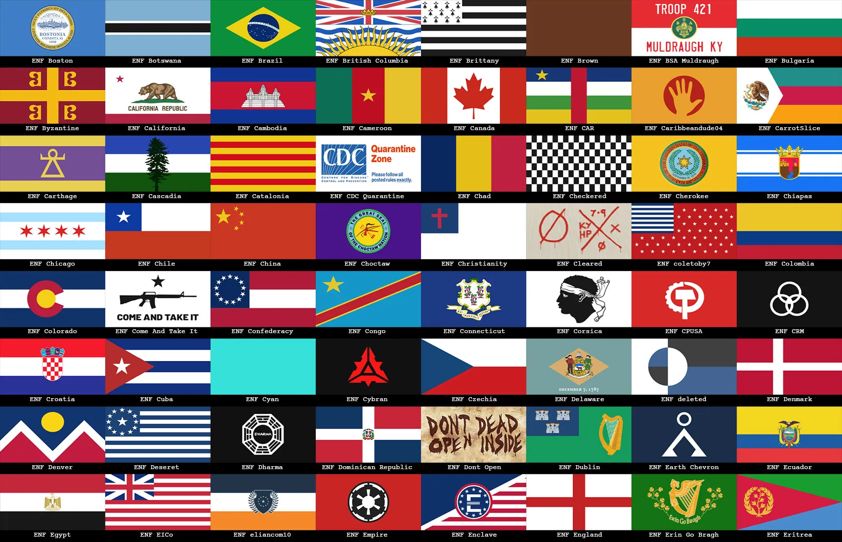 Included in this pack are: National flags (unfortunately not all nations are included, but it is a vast majority), European regional flags, Canadian provincial flags, US state flags, historical flags, independence movement flags, fictional flags from media, US national and international organization flags, various protest flags, pride flags, a collection random flags and banners, some handwritten "flags" using bedsheets for flavor and base labeling, and a selection of flags that are my favorites from reddit's r/vexillology subreddit.