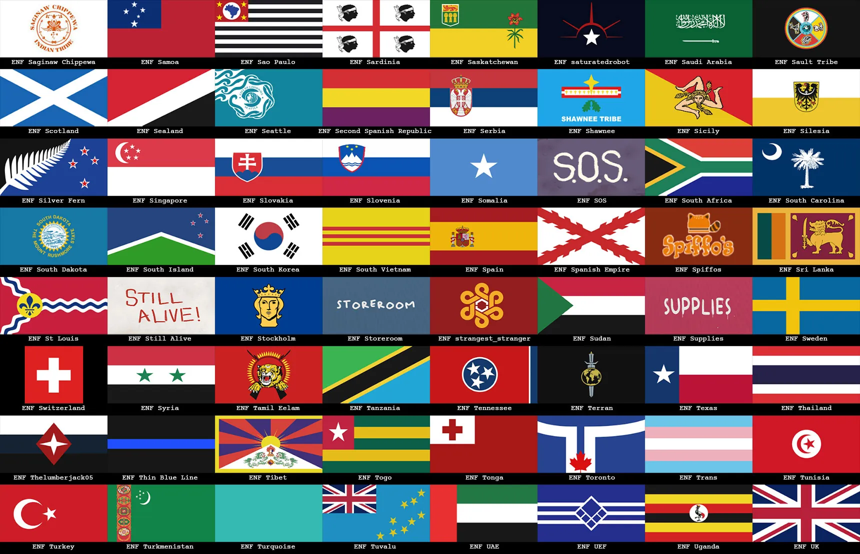Multiplayer server admins can spawn the flags using the names provided in the screenshots. As a point of note, all flags in this pack begin with the prefix "ENF" (ExtraNoise's Flags) followed by the flag name. Small flags include the suffix "Small". These are great for adding character to servers whose players might want to establish boundaries for their faction or other player representation.