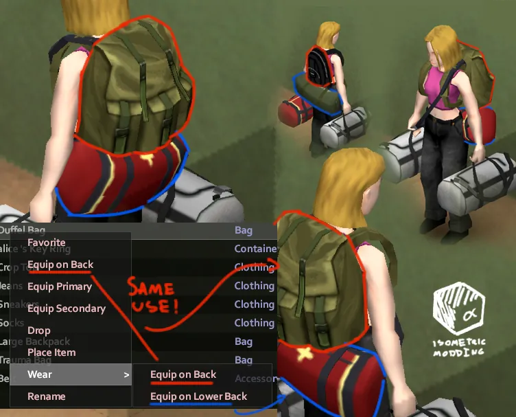 This mod lets you equip the vanilla Duffel Bag on your back or lower back, can be used with any backpacks (modded or not) as this mod only adds an extra option to the vanilla Duffel Bag. You don't need to craft or learn/read anything, just right click your Duffel Bag and you should see the [b]Wear[/b] option. There you can choose between [b]Equip on Back[/b] and [b]Equip on Lower Back[/b].