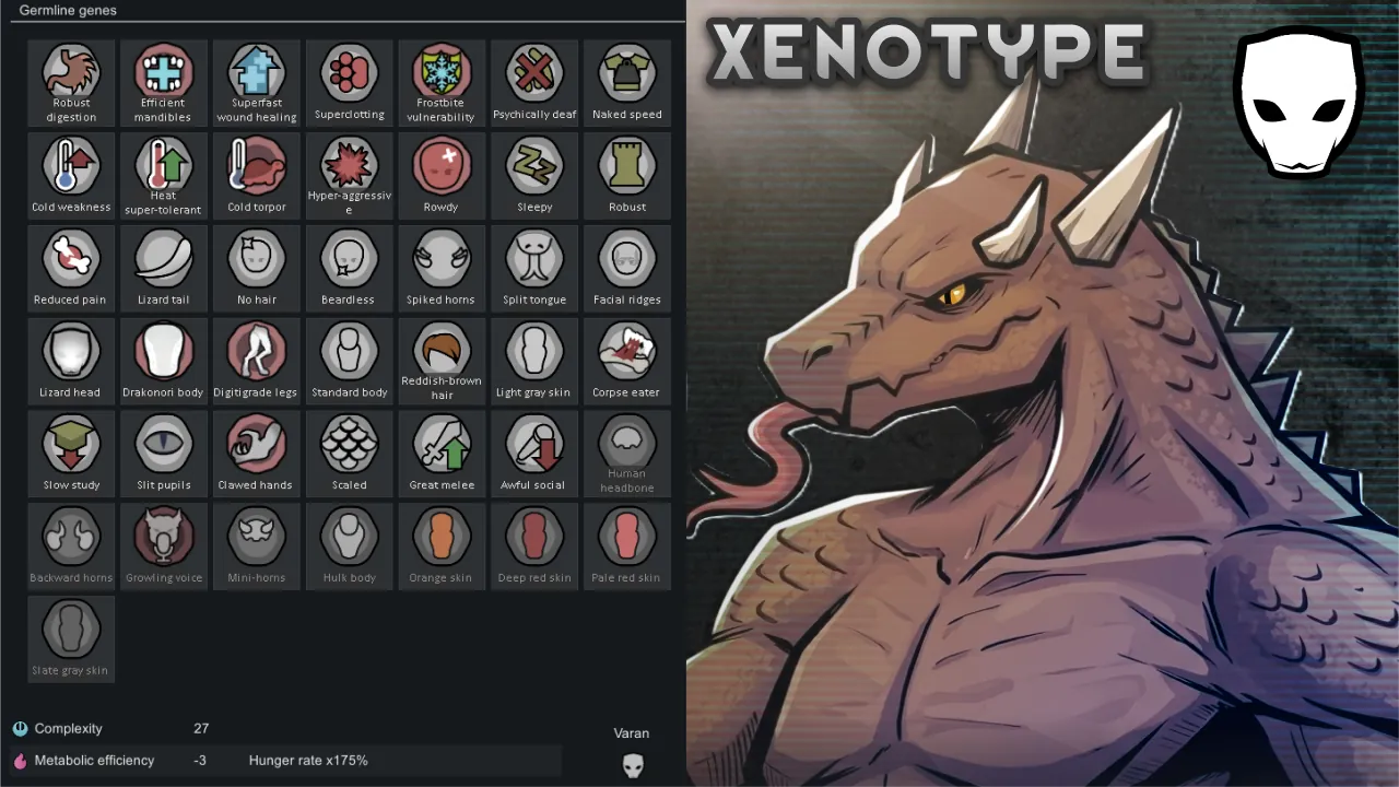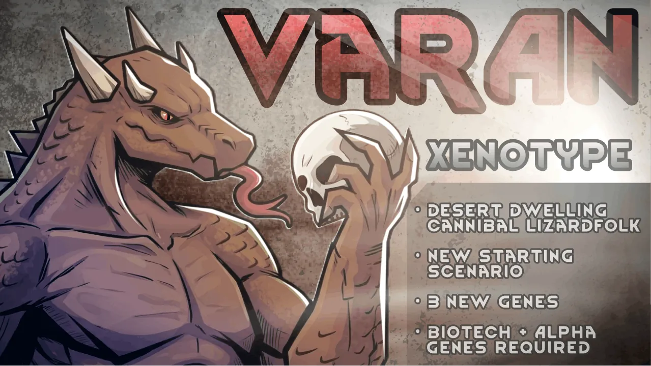 This mod simply adds two new xenotypes, a hostile faction, a new scenario and three new genes. Introducing the Varan, an extremely strong and violent race of lizardfolk who have lived on this Rimworld for centuries. They are specifically built to thrive in desert environments, and do not survive long in cold biomes.