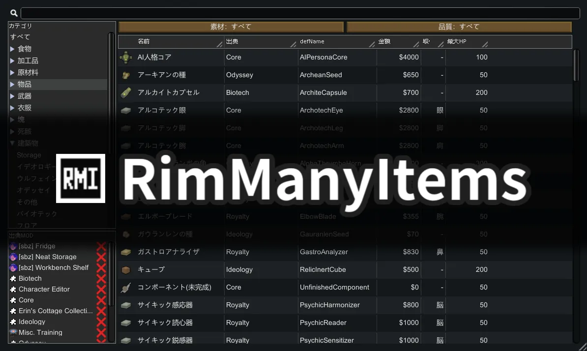 ゲーム内アイテムブラウザタブです。全アイテム・建築物・床材を1画面で一覧・ソート・フィルタできます。アイテム情報パネルの任意のStatにカーソルを当ててピンボタンを押すと列として追加可能。組み込み列(射程・ダメージ・カバレッジ・防具レイヤー・作成順)と任意のStat列に対応。数値範囲・部分一致・セットフィルタを搭載。ネタバレ配慮モード搭載:Modセッティングで有効にすると、まだ研究・製造できず、マップ上で一度も見かけたことのないアイテム・建築物・床材を非表示にします。HarmonyでStatを動的に読み取るため全Modに対応。セーブへの追加・削除ともに安全。