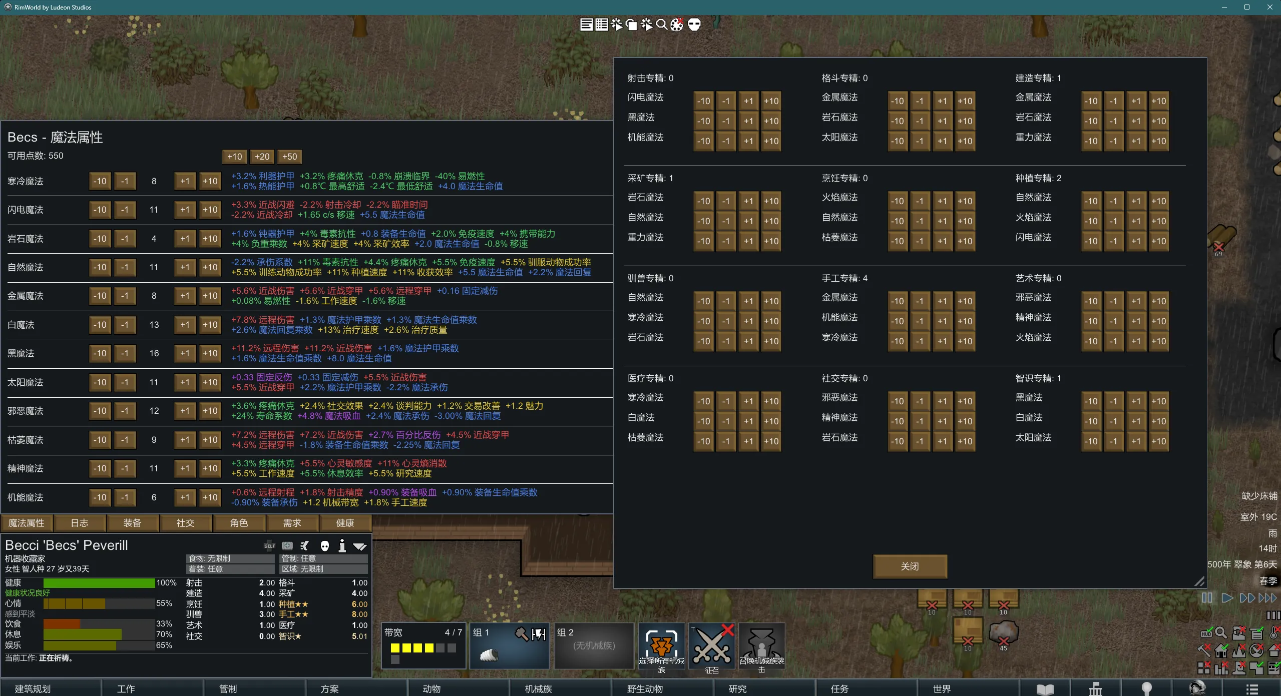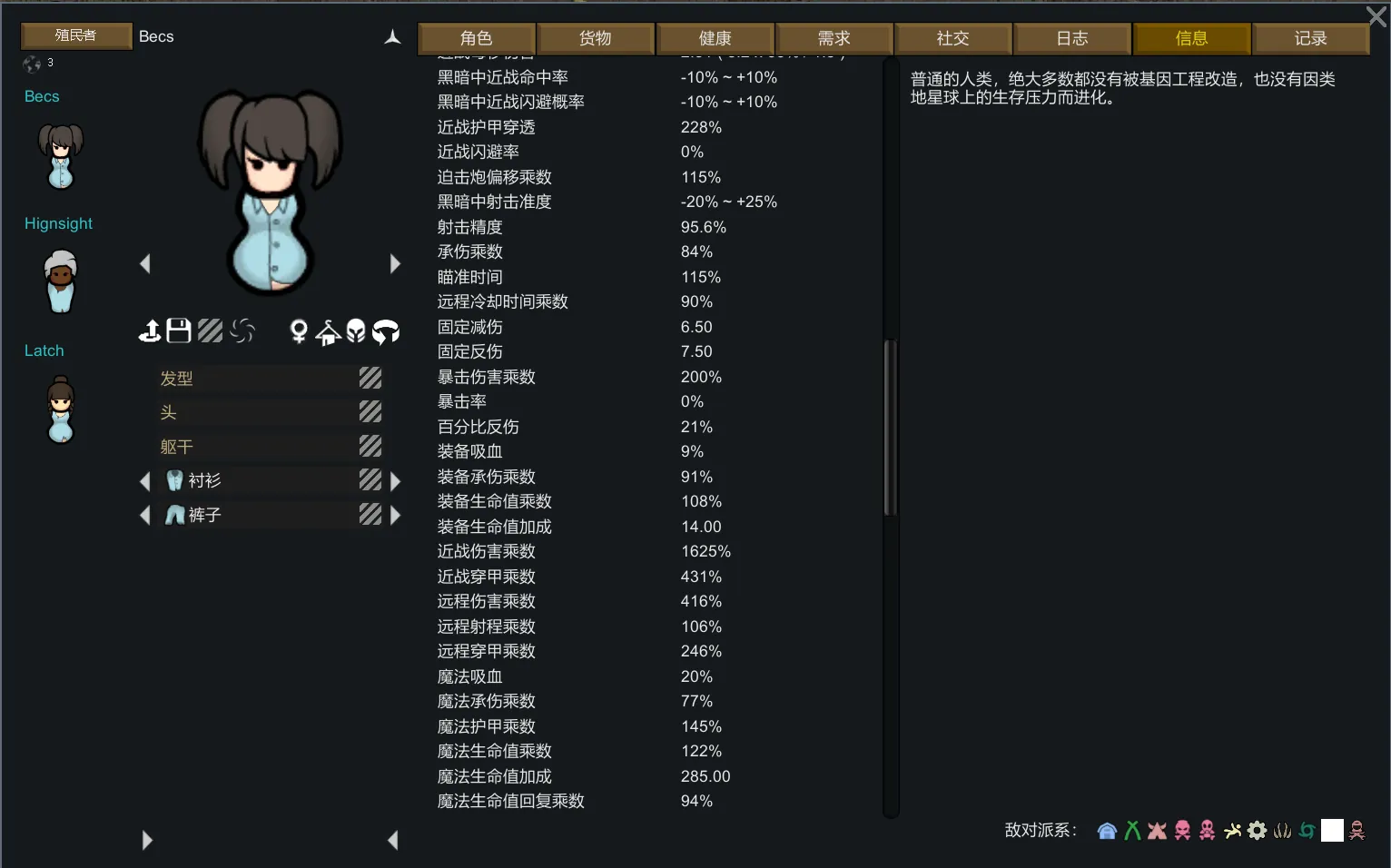 本模组性能瓶颈集中在血条绘制系统。其他系统在正常规模殖民地中几乎不消耗性能。加点退点、购买点数、资源扣除、伤害管道、护甲穿甲增伤计算、专精点数分配、食材记忆更新、治疗复活装备变更等仅在特定事件触发,日常无消耗。各类血量自动回复约每40秒检查一次,仅对玩家单位生效。血量上限同步已优化为约15秒执行一次,仅对玩家单位生效。血条绘制是主要性能开销。大规模战斗时可通过右下角设置窗口按阵营独立关闭血条和数字,关闭后对应角色不再执行血条相关计算。
