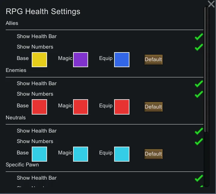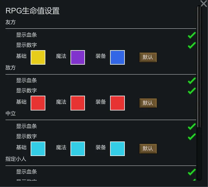 水平三色血条,上方可显示数字。在右下角工具栏,每个阵营的基础、魔法、装备血条颜色可独立调整。友方、敌方、中立、指定小人各自独立开关。兼容RimHUD,预设编辑器可添加三个第三方部件。