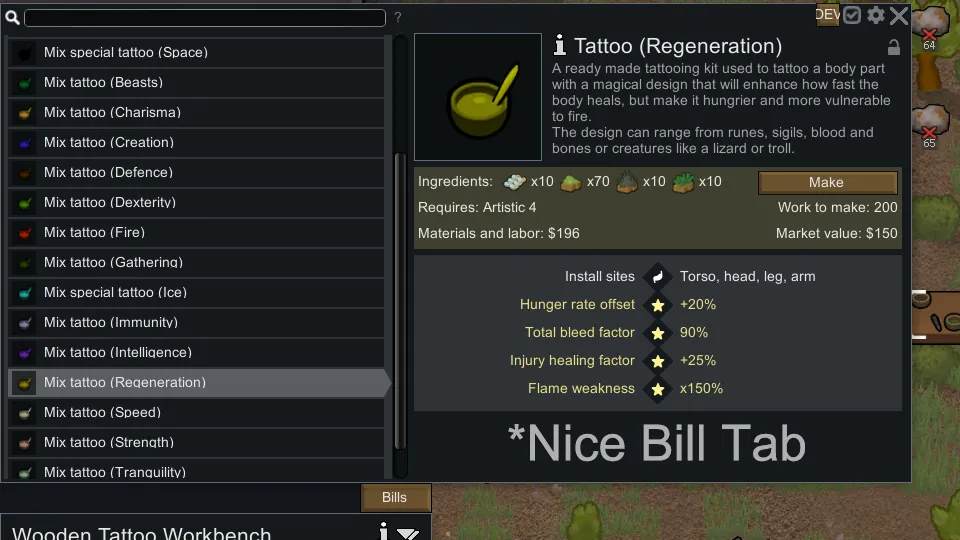 I recommend using [url=https://steamcommunity.com/sharedfiles/filedetails/?id=3520130671]Nice Bill Tab[/url] or [url=https://steamcommunity.com/sharedfiles/filedetails/?id=1446523594]Dubs Mint Menus[/url] to see the tattoos stats more easily in the crafting menu.