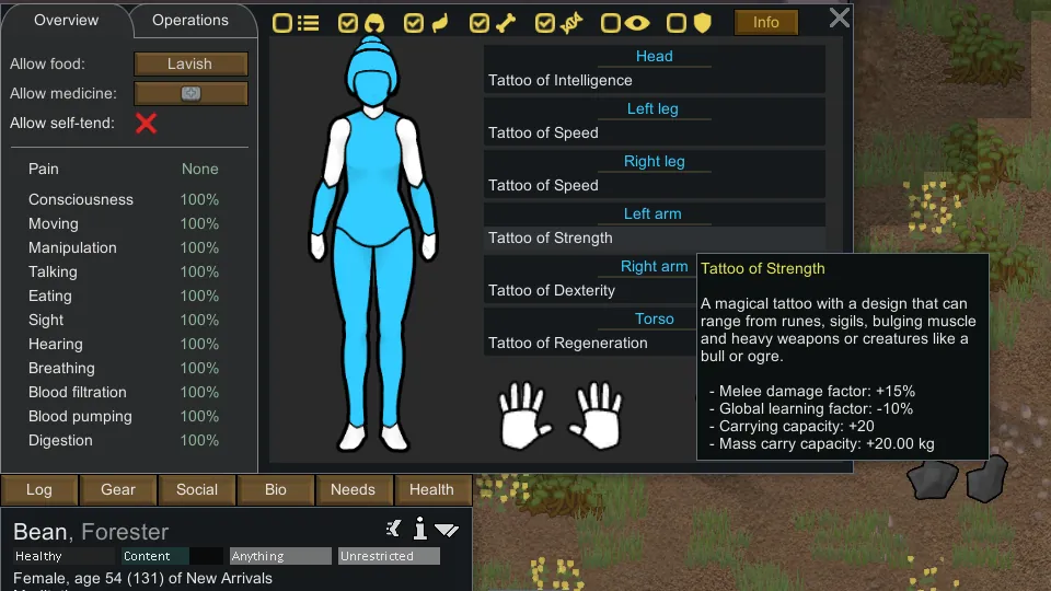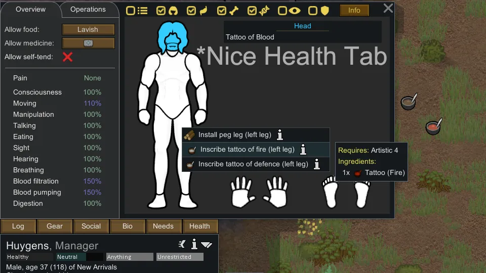 On a pawn with no tattoo or prostetic, each type of Tattoo item in the map will create 6 surgery bills in the menu (1 for each available body part per tattoo item), it will flood the menu fast so searching with [url=https://steamcommunity.com/sharedfiles/filedetails/?id=1446523594]Dubs Mint Menus[/url] can help, but the best is using [url=https://steamcommunity.com/sharedfiles/filedetails/?id=33287299021]Nice Health Tab[/url] which let you click on the body part directly and only show its surgeries. The alternative would be to limit which body part accept what tattoo (For example, speed on legs only). So unless people start requesting that change, try to only craft the kits you need or use the mods above.