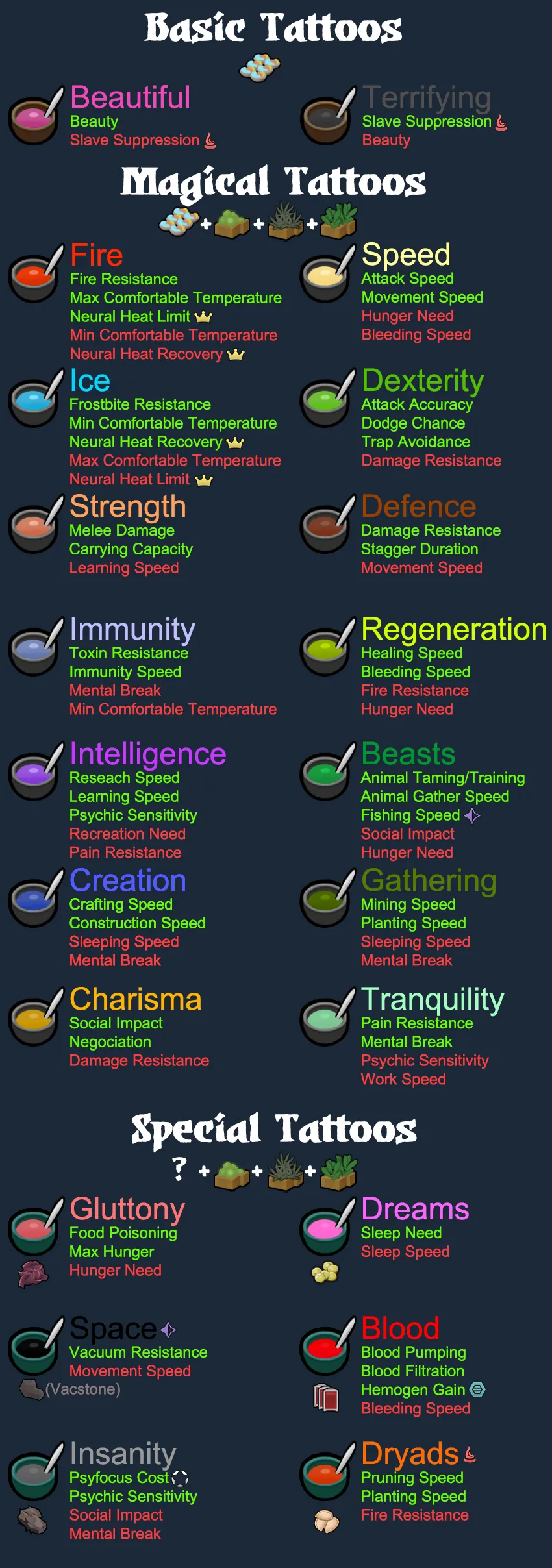 They are pretty cheap, being tribal and all, but they all have downsides that can stack up pretty quickly. A pawn with 5 tattoos of speed will attack twice as fast, but will also bleed out more than twice as fast. So using a variety of tattoos is generally optimal unless you have a way to mitigate the stacking penalties.
