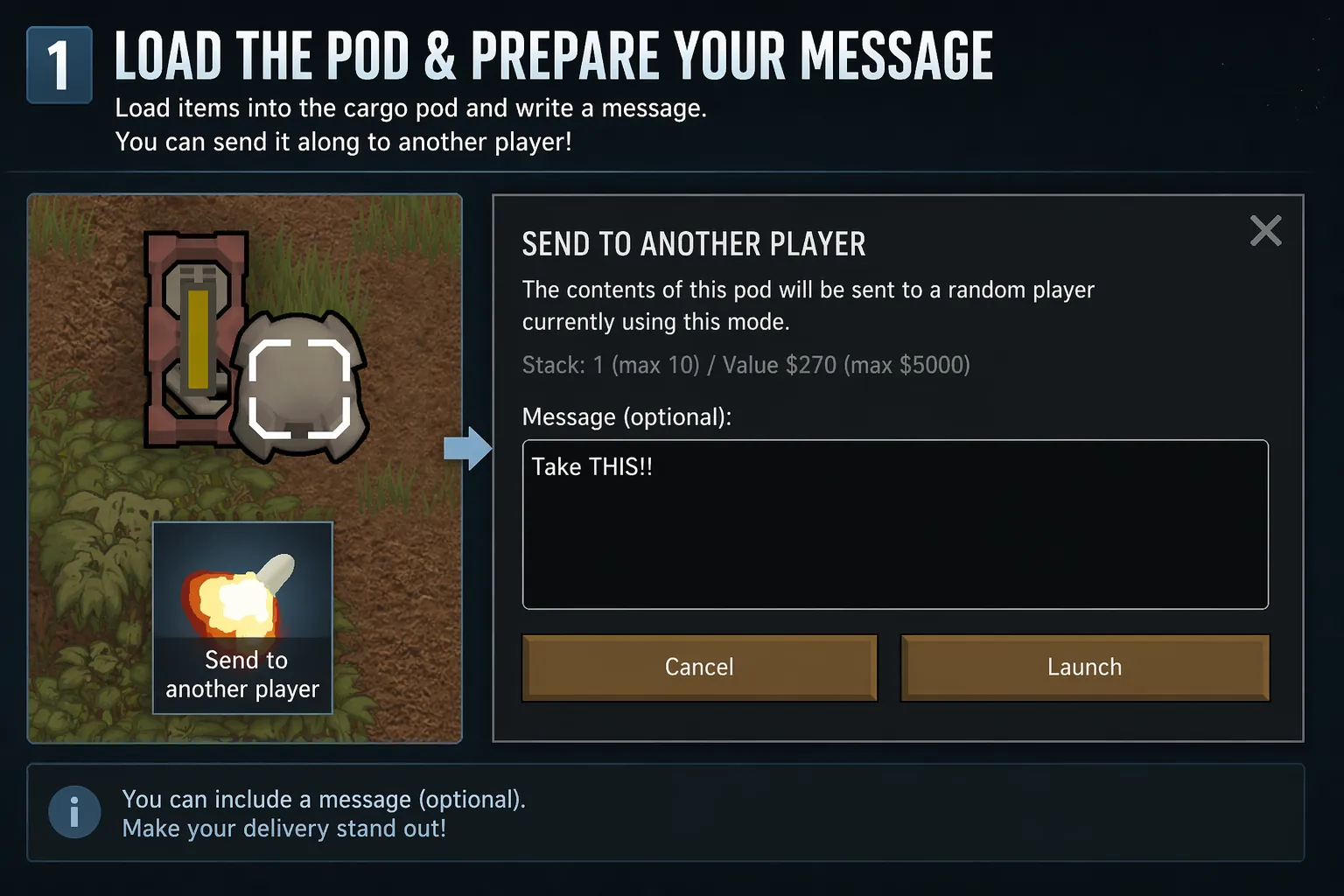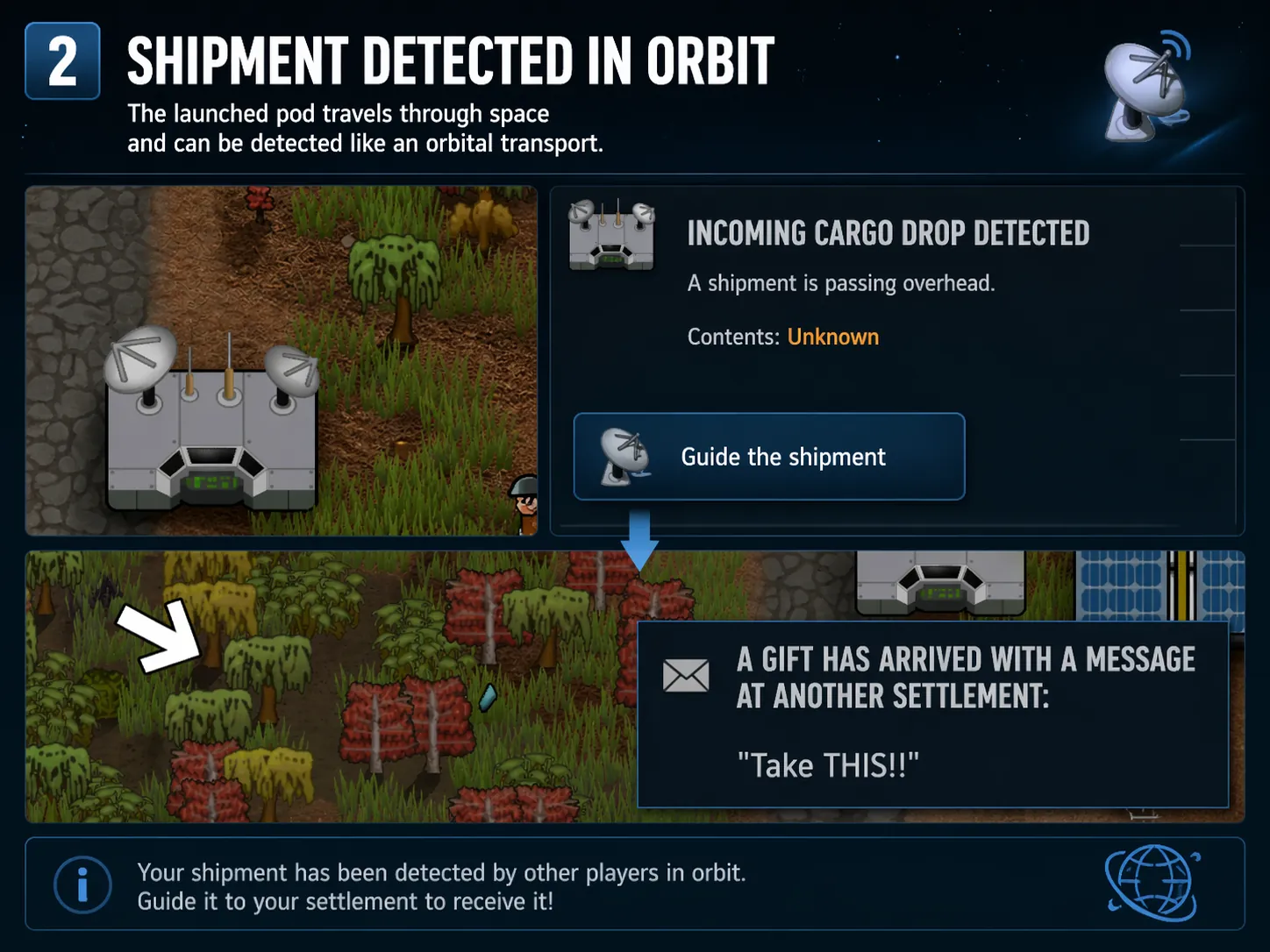 Send [b]items and messages to other players’ colonies[/b] using transport pods.
