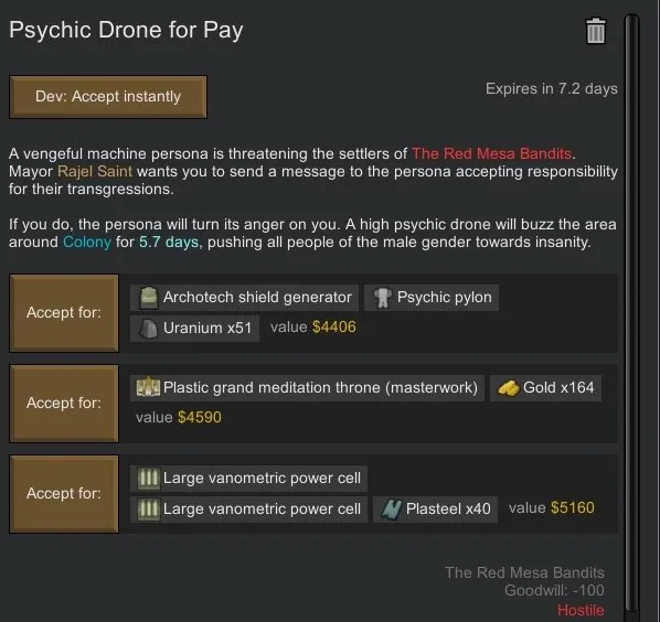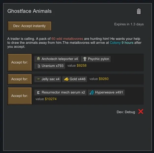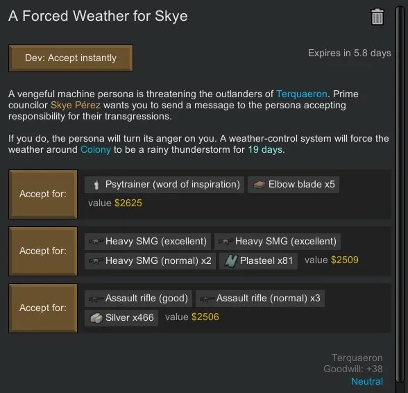 1. [b]More Archotech Awards[/b] - Groups all of the archotech items/buildings/consumables into their own category of quest reward with its own separate chance of being rolled, which increases the frequency they appear (which is still pretty rare; about as much as receiving a healer mech serum or similar item).