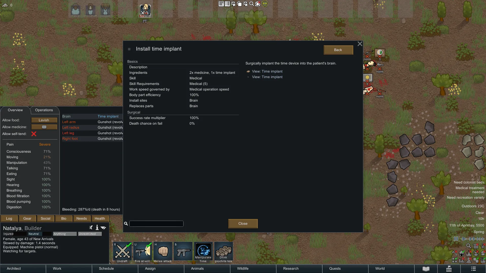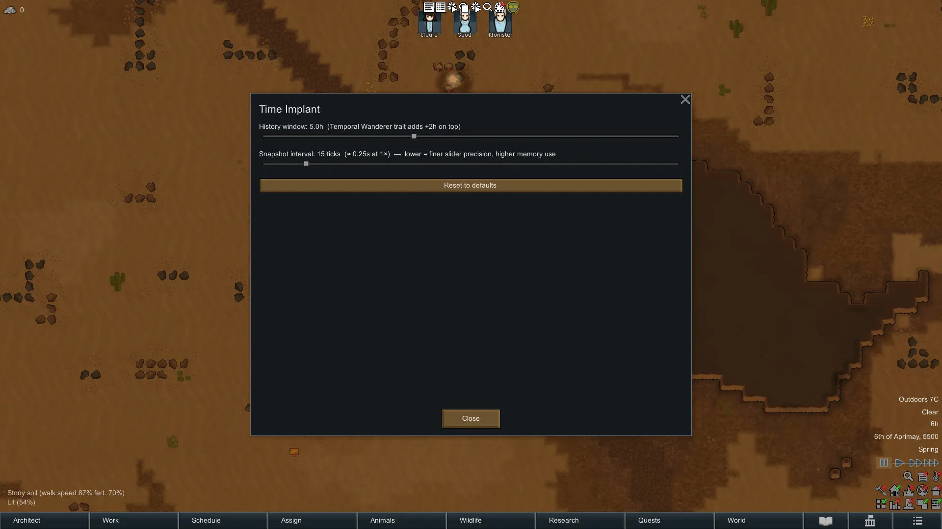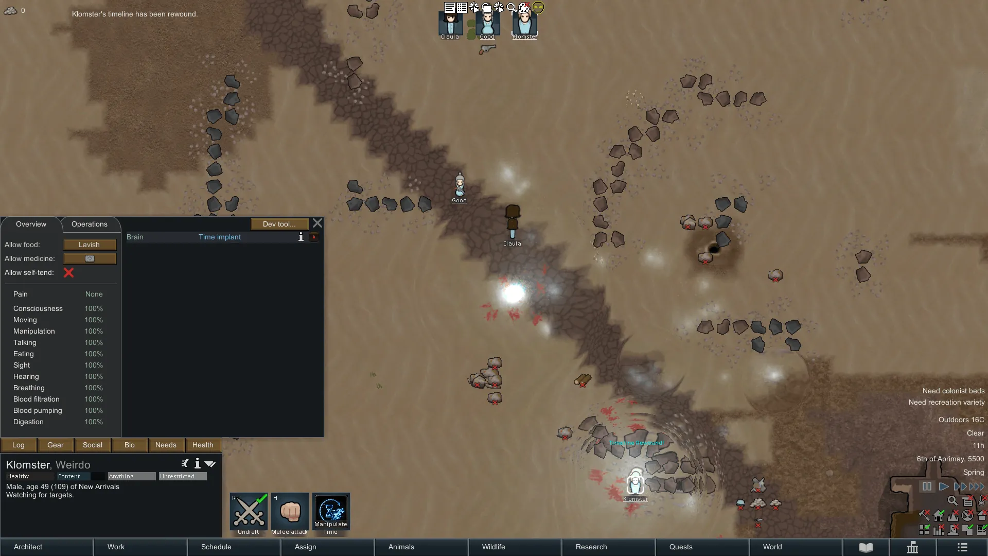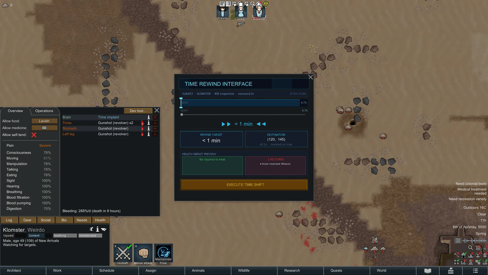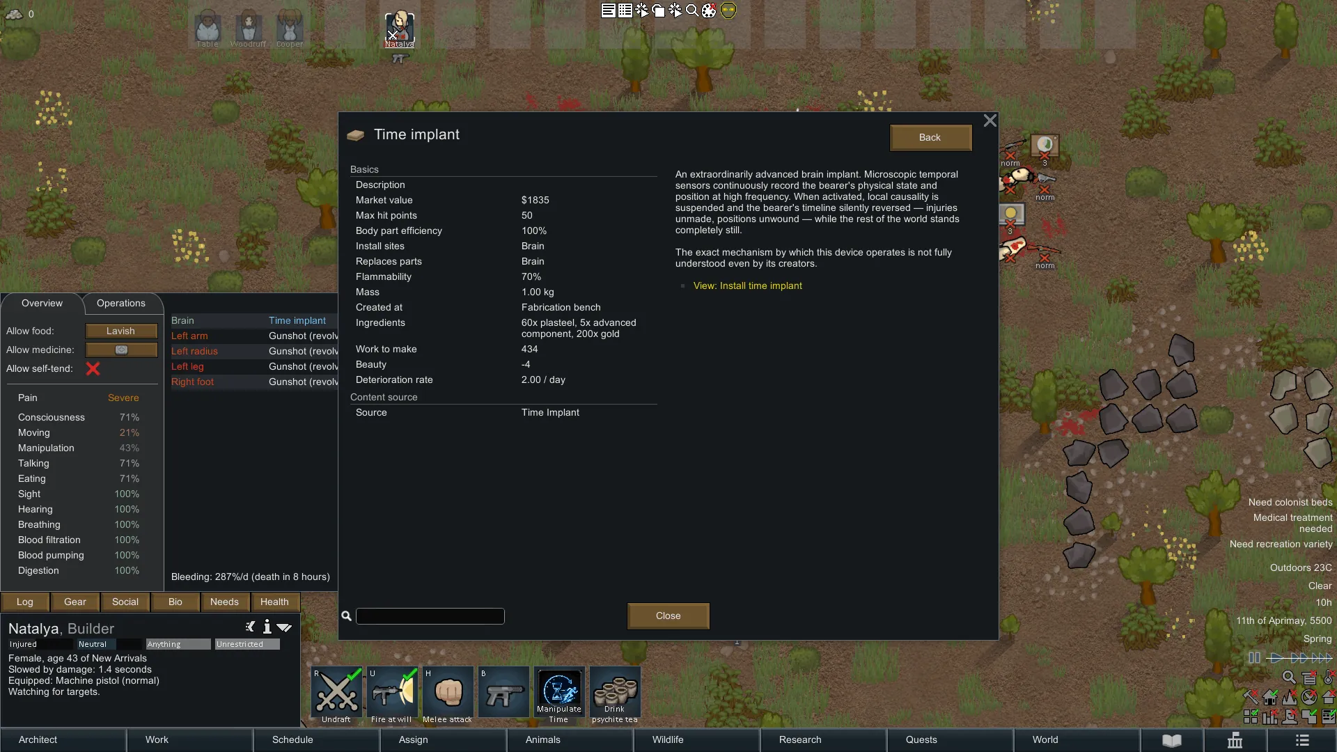 The implant does not rewind the world — only the bearer's health and position. Other pawns, items, the map, and time itself are completely unaffected. This makes it a powerful personal survival tool rather than a save-scum button for the whole colony.