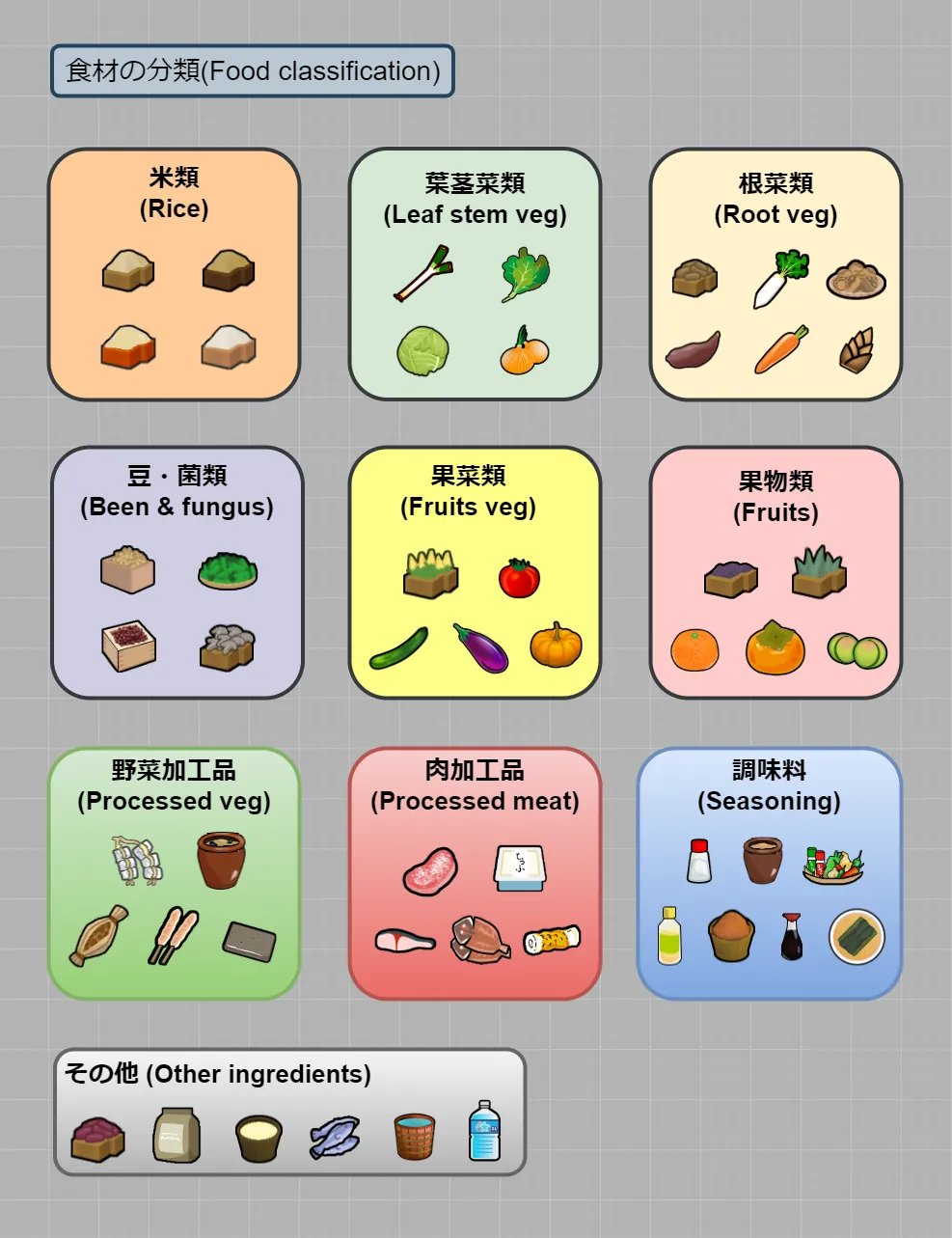 詳細は上の画像チャートの料理と調味料と食材加工,食材の分類を参照してください。