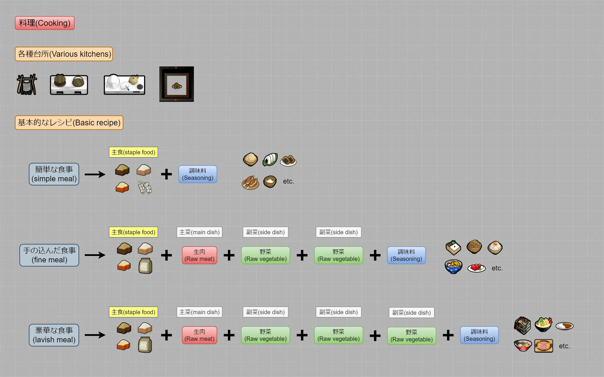 ・食べて強くなるRPG的な要素を追加しています。(効果が出るには沢山の料理が必要です。テスト段階)