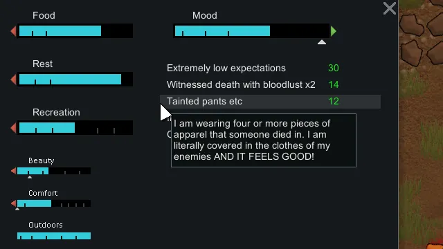 This mod changes the Tainted Clothes debuff so it no longer applies to pawns without bloodlust.