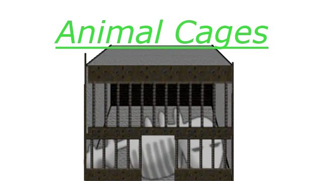 * Currently has cages of a 2×3, 3×3 and 5x5 sizes capable of holding a single animal/three/two animals respectively of most sizes (up to and including the size of a human). Should fit most vanilla animals.