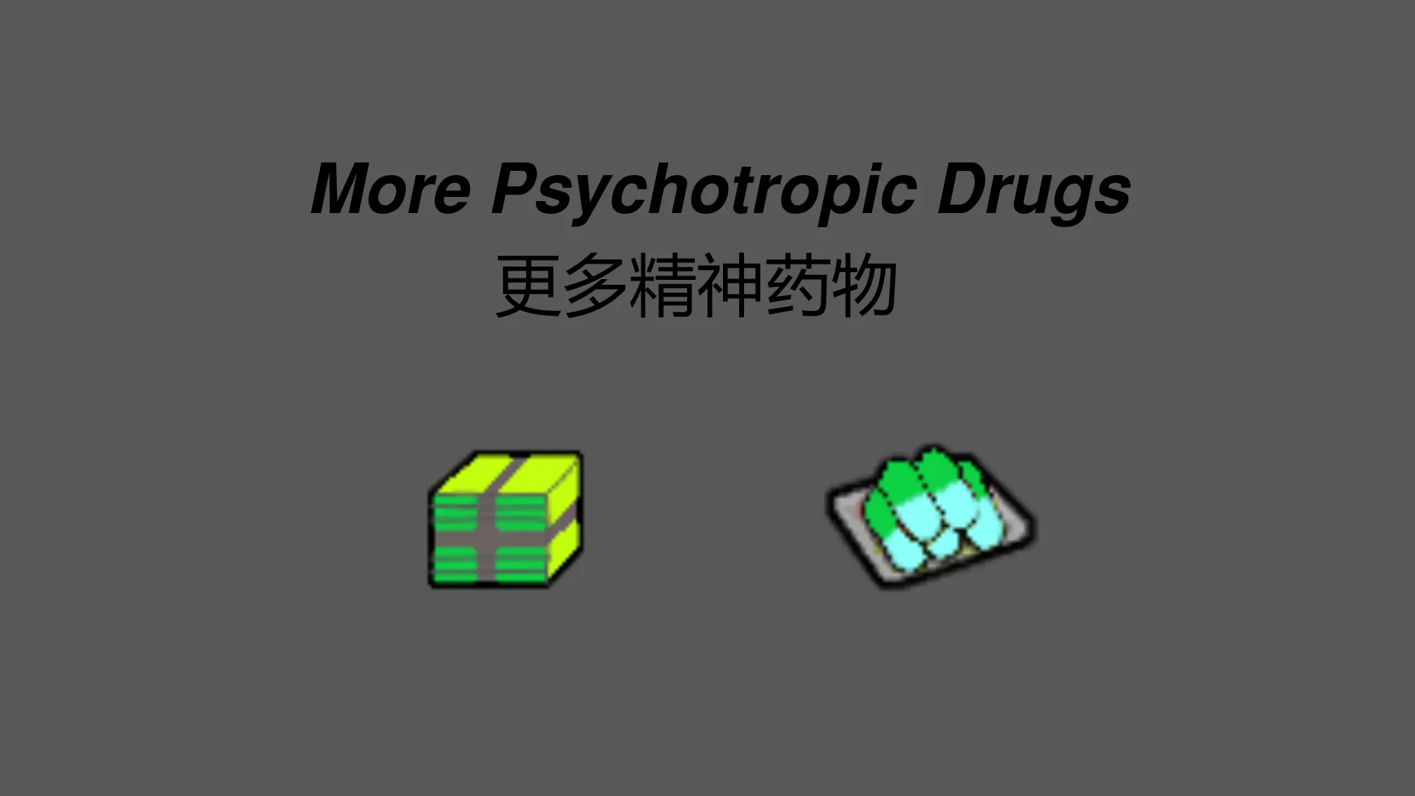 A simple extension of the original psychotropic drug, we can now make use of psychic leaf in the early and late game!With the addition of two psychotropic drugs: ChewingLeaves and SleeplessInjections.The tribe's residents can better stay happy in low-tech times, while outsiders can study the corresponding technology to obtain a dangerous addictive substance comparable to Luciferium.Note that you need a new addiction program to regulate new drugs!